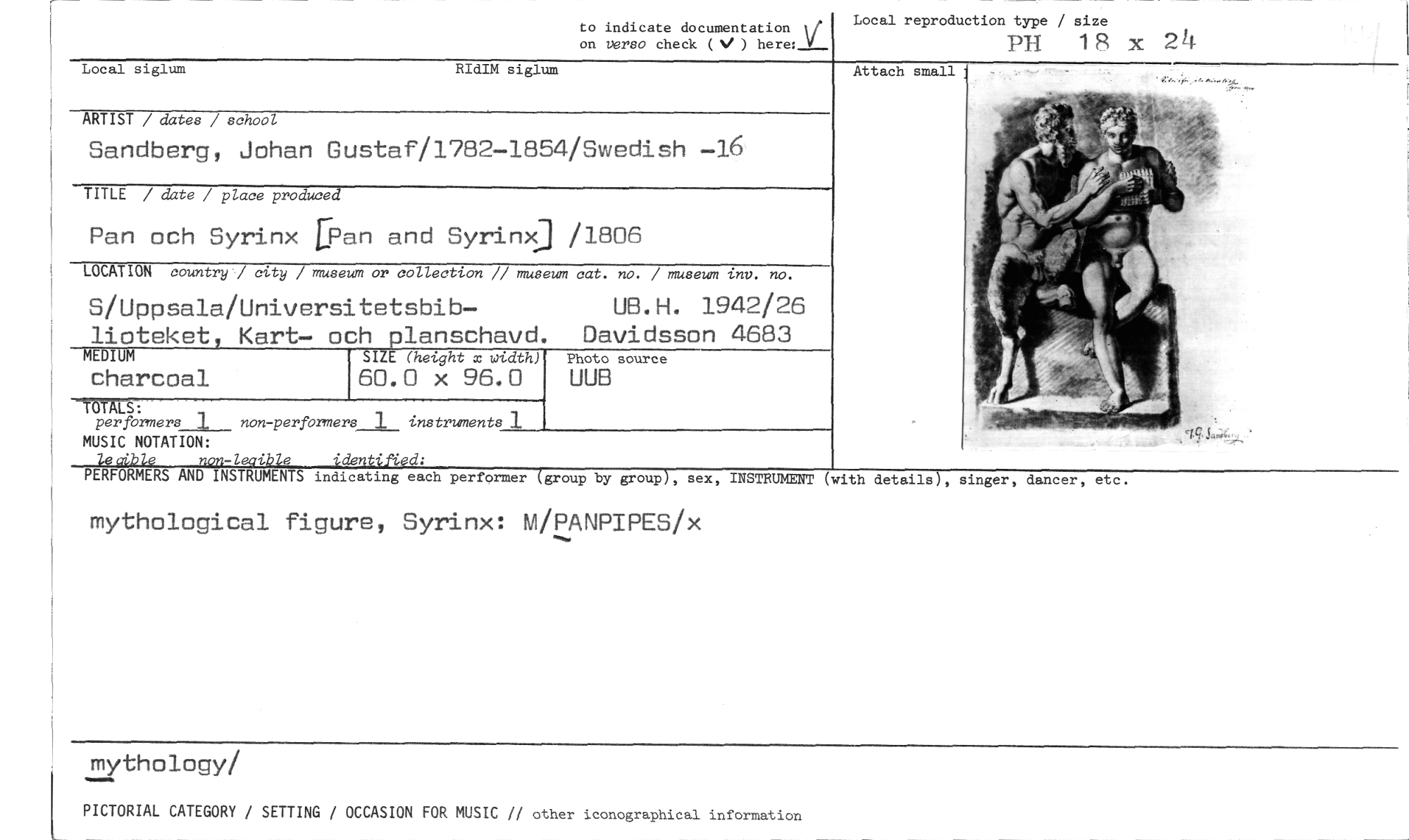 //// to indicate documentation vt on versa check (V ) here:2_ //// Local reproduction type / size //// Ffi 18 x 24 //// Local siglum //// Attach small //// RIdIM siglum //// ARTIST / dates / school //// Sandberg, Johan Gustaf/1782-1854/Swedish —16 //// TITLE / date / place produced //// Pan och Syrinx [Pan and Syrinx] /1806 //// LOCATION country / city / museum or collection // museum cat. no. / museum tnv. no. //// S/Uppsala/Universitetsbiblioteket, Kart— och planschavd //// MEDIUM SIZE (height x width) //// charcoal 60.0 x 96.0 //// UB.H. 1942/26 Davidsson 4683 //// Photo source //// UUB //// TÖTALS : //// per formers 1 non-performers 1 instruments 1 //// MUSIC NOTATION: //// is aible non-lecible identilUd: //// PERFORMERS AND INSTRUMENTS indicating each performer (group by group), sex, INSTRUMENT //// (with details), singer, dancer, etc. //// mythological figurs, Syrinx: M/PANPIPES/x //// mythology/ //// PICTORIAL CATEGORY / SETTING / OCCASION FOR MUSIC // other iconographical information ////
