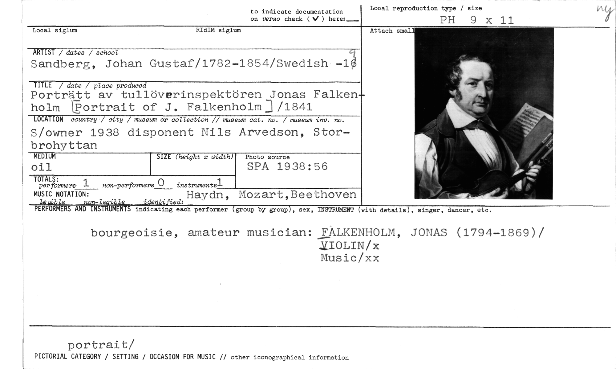 //// Local reproduction type / size //// PH 9 x 11 //// Attach smal //// to indicate documentation //// on versa check (V ) here:_ //// Local siglum RIdIM siglum //// ARTIST / dates / school //// Sandberg, Johan Gustaf/1782-1854/Swedish //// TITLE / date / place produced //// Porträtt av tullöverinspektören Jonas Falken holm tgortrait of J. Falkenholm] /1841 //// LOCATION country / city / museum or collection // museum cat. no. / museum inv. no. //// S/owner 1938 disponent Nils Arvedson, Stor-brohyttan //// MEDIUM //// oil //// TS LS: //// per formers 1 non-perfbrmers 0 instrumentel //// MUSIC NOTATION: Haydn, mozart,Beethoven //// le alble nnn-leaible iMntifivd: " //// PERFORMERS AND INSTRUMENTS indicating each performer (group by group), sex, INSTRUMENT (with details), singer, //// bourgeoisie, amateur musician: FALKENHOLM, JONAS (1794-1869)/ //// .UOLIN/x Music/xx //// portrait/ //// PICTORIAL CATEGORY / SETTING / OCCASION FOR MUSIC // other iconographical information //// SIZE (height x width) //// Photo source //// SPA 1938:56 //// dancer, etc. ////