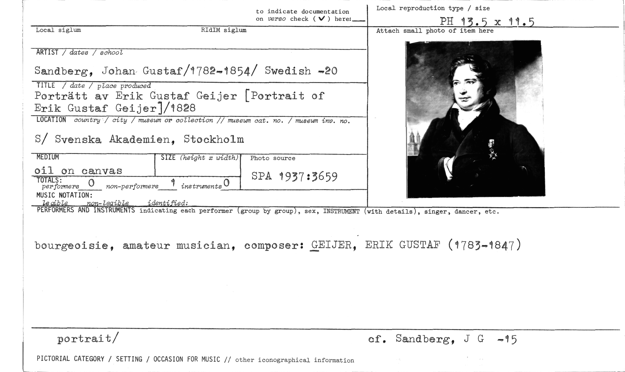 //// cf. Sandberg, J G -15 //// portrait/ //// PICTORIAL CATEGORY / SETTING / OCCASION FOR MUSIC // other iconographical information //// Local siglum RIdIM siglum //// to indicate documentation on versa check (V ) //// Local reproduction type / size //// PH 13.5 x 11.5 //// ARTIST / dates / school //// Sandberg, Johan Gustaf/1782-1854/ Swedish -20 //// TITLE / date / place produced //// Porträtt av Erik Gustaf Geijer [Portrait of Erik Gustaf Geijer1/1828 //// LOCATION country./ city / museum or collection // museum cat. no. / museum Inv. no. //// S/ Svenska Akademien, Stockholm //// MEDIUM //// oil on canvas //// per formers ° non-perfOrmers 1 instruments //// MUSIC NOTATION: //// non-leaible identilYed: //// PERFORMERS AND INSTRUMENTS indicating each performer (group by group), sex, INSTRUMENT (with details), singer, dancer, etc. //// bourgeoisie, amateur musician, tomposer: GEIJER, ERIK GUSTAF (1783-1847) //// SIZE (height x width) //// Attach small photo of item here //// Photo source //// SPA 1937:3659 ////