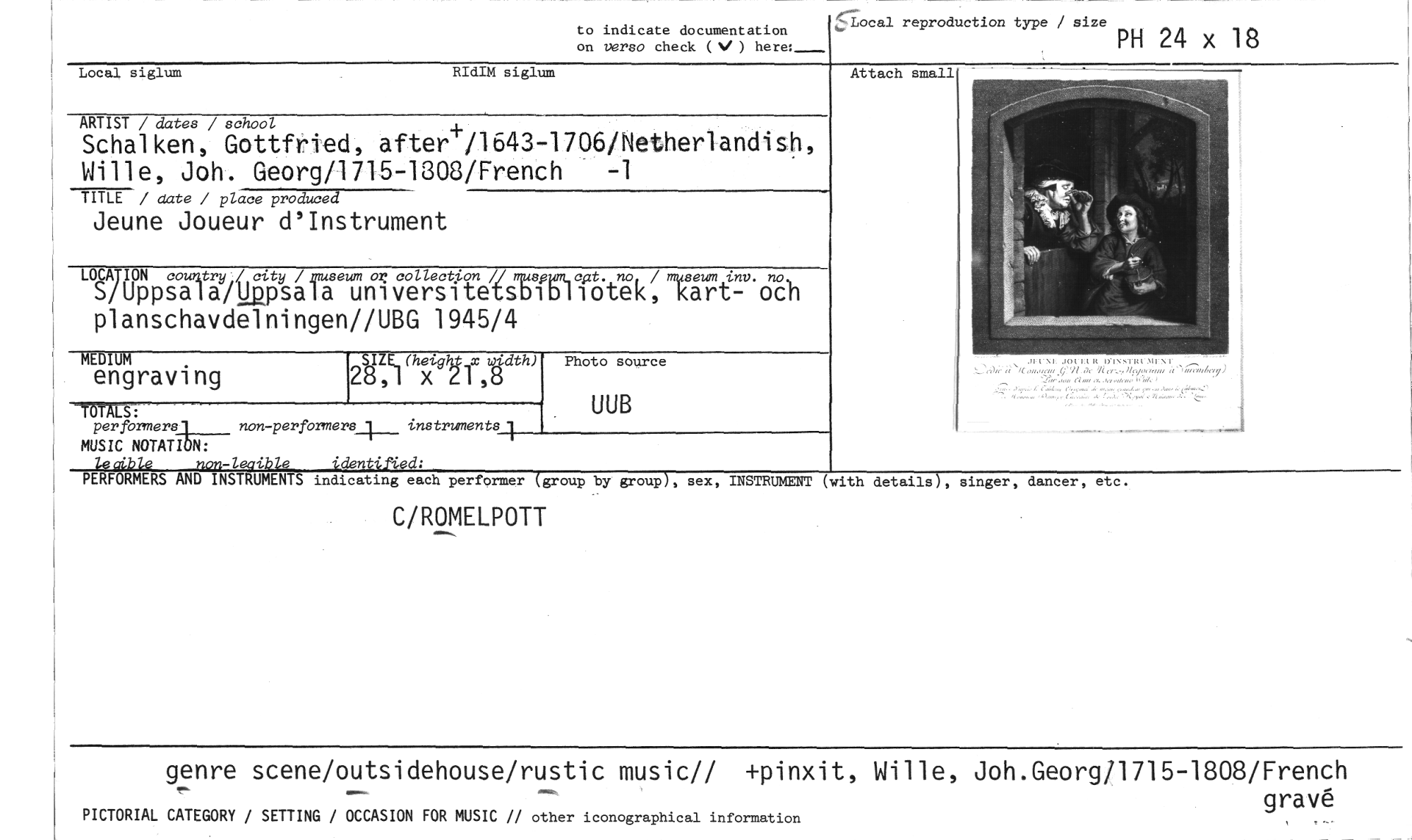 //// reproduction type / size //// PH 24 x 18 //// to indicate documentation on verso check (N/ ) here: //// Local siglum RIdIM siglum //// ARTIST / dates / school //// Schalken, Gottfried, alter /1643-1706/Netherlandish, Wille, Joh. Georg/1715-1808/French -1 //// TITLE / date / place produced //// Jeune Joueur d'Instrument //// LOCATION co try /ffluseumoncolle~//musno / mise2.0 int). no //// S/Uppsala/gusa[a universitetsbibilOtek, kart- och planschavdelningen//UBG 1945/4 //// MEDIUM AZE1(hexiglif :gdth) //// engraving //// //// 1.TM-- //// per formers' non-performers_l___ instruments //// MUSIC NOTATION: //// locible non-leaible identified: //// PERFORMERS AND INSTRUMENTS indicating each performer (group by group), sex, //// C/ROMELPOTT //// Photo source //// UUB //// At ach small //// INSTRUMENT (with details), singer, dancer, etc. //// genre scene/outsidehouse/rustic music// +pinxit, Wille, Joh.Georg/1715-1808/French //// gravå. //// PICTORIAL CATEGORY / SETTING / OCCASION FOR MUSIC // other iconographical information ////