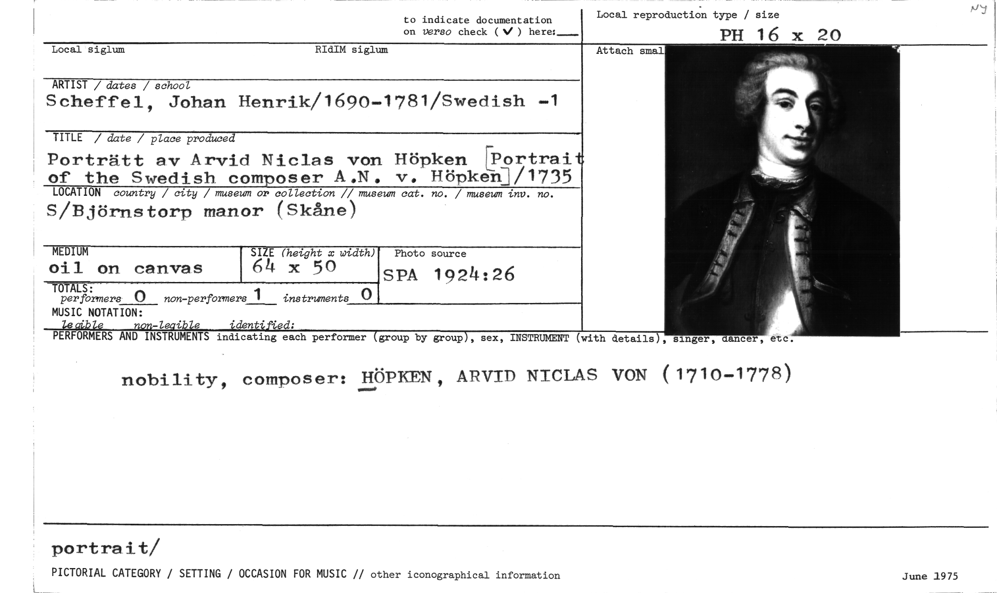 //// Local reproduction type / size //// PH 16 x 20 //// to indicate documentation //// on verso check (V ) here:_ //// Local siglum RIdIM siglum //// ARTIST / dates / school //// Scheffel, Johan Henrik/1690-1781/Swedish -1 //// TITLE / date / place p oduced //// Porträtt av Arvid Niclas von Höpken [Portrait of the Swedish. composer A.N. v. Höpken]/1735 //// LOCATION country / city / museum or collection // museum cat. no. / museum inv. no. //// S/Björnstorp manor (Skåne) //// MEDIUM canvas SIZE (height x width) Photo source //// oil on 64 x 50 SPÅ 1924:26 //// —MWS: () non-performe2T 1 instruments () //// per formers //// MUSIC NOTATION: //// ?i • -1 i e 'dån ed: //// PERFORMERS AND INSTRUMENTS indicating each performer (group by group), sex, INSTRUMENT (with details), s nger, ancer, etc. //// nobility, composer: HÖPKEN, ARVID NICLAS VON (1710-1778) //// portrait/ //// PICTORIAL CATEGORY / SETTING / OCCASION FOR MUSIC // other iconographical information //// June 1975 ////