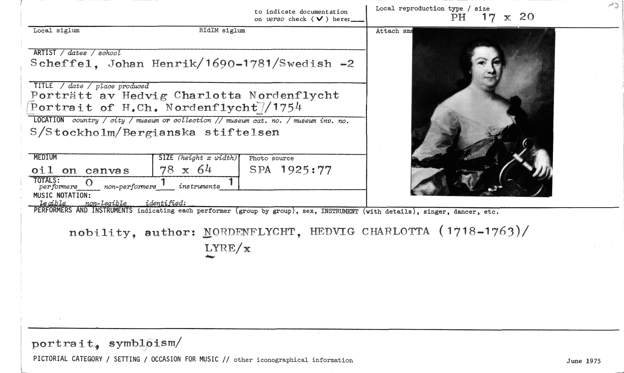 //// nobility, author: NORDENFLYCHT, HEDVIG CHARLOTTA (1718-1763)/ LYRE/x //// portrait4 symbloism/ June 1975 //// PICTORIAL CATEGORY / SETTING / OCCASION FOR MUSIC // other iconographical information //// Local siglum RIdIM siglum //// ARTIST / dates / school //// Scheffel, Johan Henrik/1690-1781/Swedish -2 //// TITLE / date / place produced //// Porträtt av Hedvig Charlotta Nordenflycht Portrait of H.Ch. Nordenflychfj1754 //// LOCATION country / city / museum or collection // museum cat. no. / museum lnv. no. //// S/Stockholm/Bergianska stiftelsen //// Attach s //// MEDIUM //// oil on canvas //// SIZE (height x width) //// 78 x 64 //// Photo source //// SPA 1925:77 //// -MUS : //// per formers non-perfbrmers 1 instruments //// MUSIC NOTATION: //// lecdble non-leaible identified: //// PERFORMERS AND INSTRUMENTS indicating each performer (group by group), sex, INSTRUMENT //// (with details), singer, dancer, etc. //// Local reproduction type / size //// PH 17 x 20 //// to indicate documentation //// on verso check (%, ) here:- //// ( ////