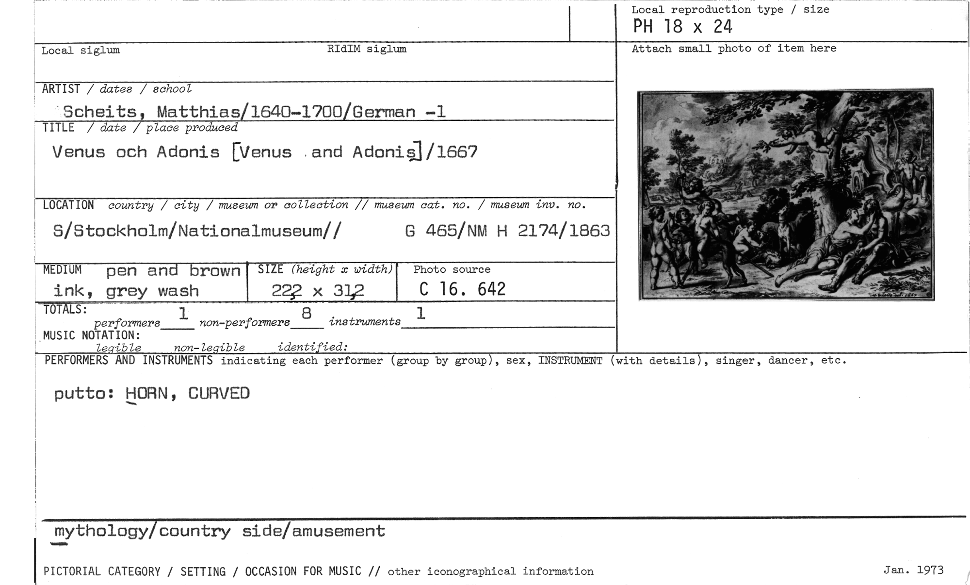 //// Local reproduction type / size //// PH 18 x 24 //// Local siglum RIdIM siglum //// ARTIST / dates / school //// Scheits, Matthias/1640-1700/German —1 //// TITLE / date / place produced //// Venus och Adonis [Venus _and Adonid/1667 //// LOCATION country / city / museum or collection // museum cat. no. / museum inv. no. //// S/Stockholm/Nationalmuseum// G 465/NM H 2174/1863 //// MEDIUM pen and brown SIZE (height x width) //// ink, grey wash 22? x 31,2 Attach small photo of item here //// Photo source //// C 16. 642 //// TOT 5: //// performers 1 8 rmers non-parformers instruments 1 //// MUSIC NOTATION: //// legible non-legible identified: //// PERFORMERS AND INSTRUMENTS indicating each performer (group by group), sex, INSTRUMENT (with details), singer, dancer, etc. //// putto: HORN, CURVED //// mythology/country side/amusement //// PICTORIAL CATEGORY / SETTING / OCCASION FOR MUSIC // other iconographical information Jan. 1973 ////