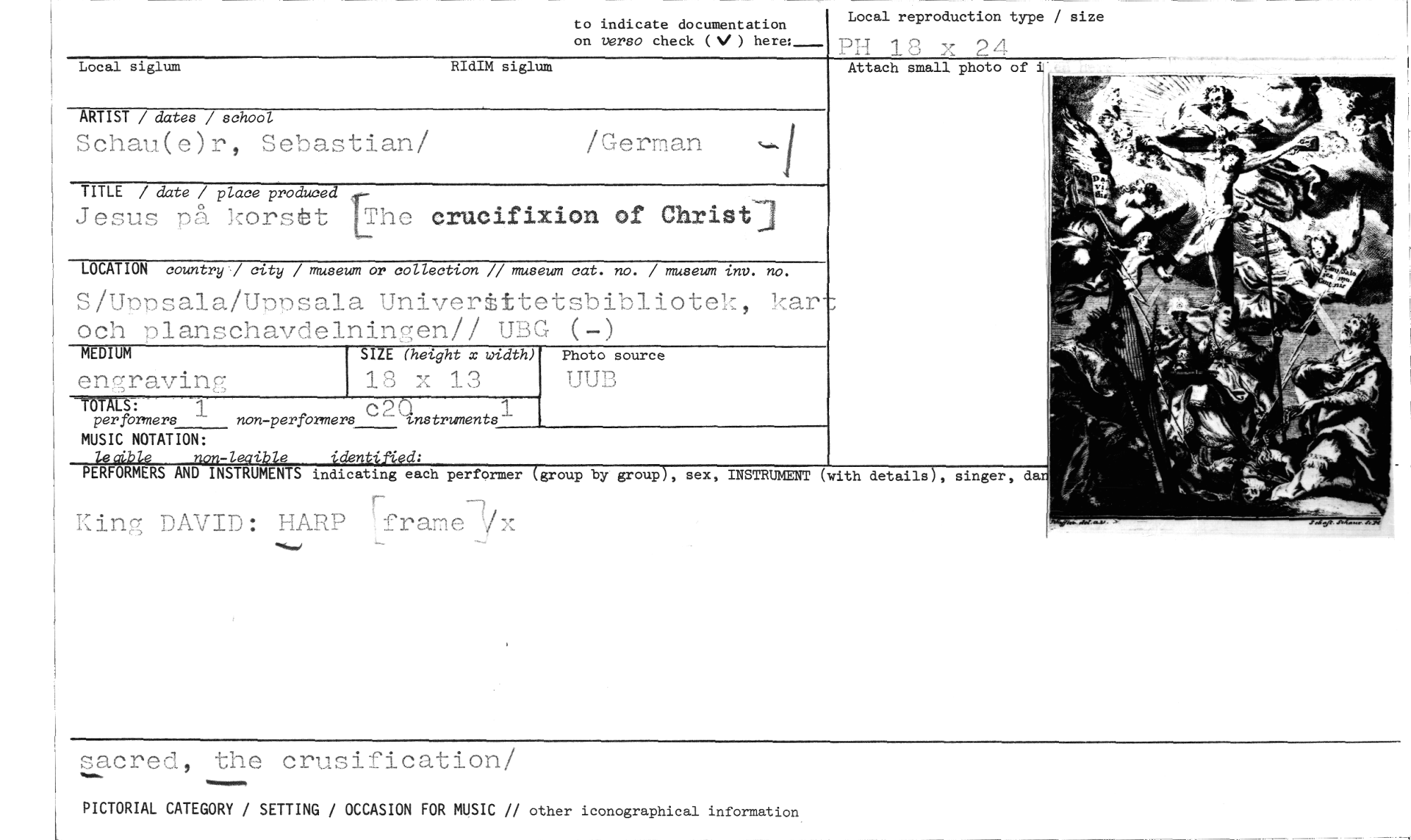 //// to indicate documentation on verso check (V) here: //// Local reproduction type / size //// PH 18 x 24 //// Local siglum RIdIM siglum //// ARTIST / dates / school //// Schau(e)r, Sebastian/ /German //// TITLE / date / place produced //// Jesus på korset IThe crucifixion of Christ //// LOCATION country / city / museum or collection // museum cat. no. / museum inv. no. //// S/Uppsala/Uppsala Univertttetsbibliotek, kar--; och planschavdelningen// UBG (-) //// Attach small photo of i //// MEDIUM SIZE (height x width) //// e=aving 18 x 13 //// TOTALS: 1 c20 //// per formers non-perfonners instruments //// Photo source //// UUB //// MUSIC NOTATION: //// non-leaible identified: //// PERFORM RS AND INSTRUMENTS indicating each performer (group by group), sex, INSTRUMENT //// King DAVID: HARP .frame N/x //// (with details), singer, dar //// sacred, the crusification/ //// PICTORIAL CATEGORY / SETTING / OCCASION FOR MUSIC // other iconographical information ////