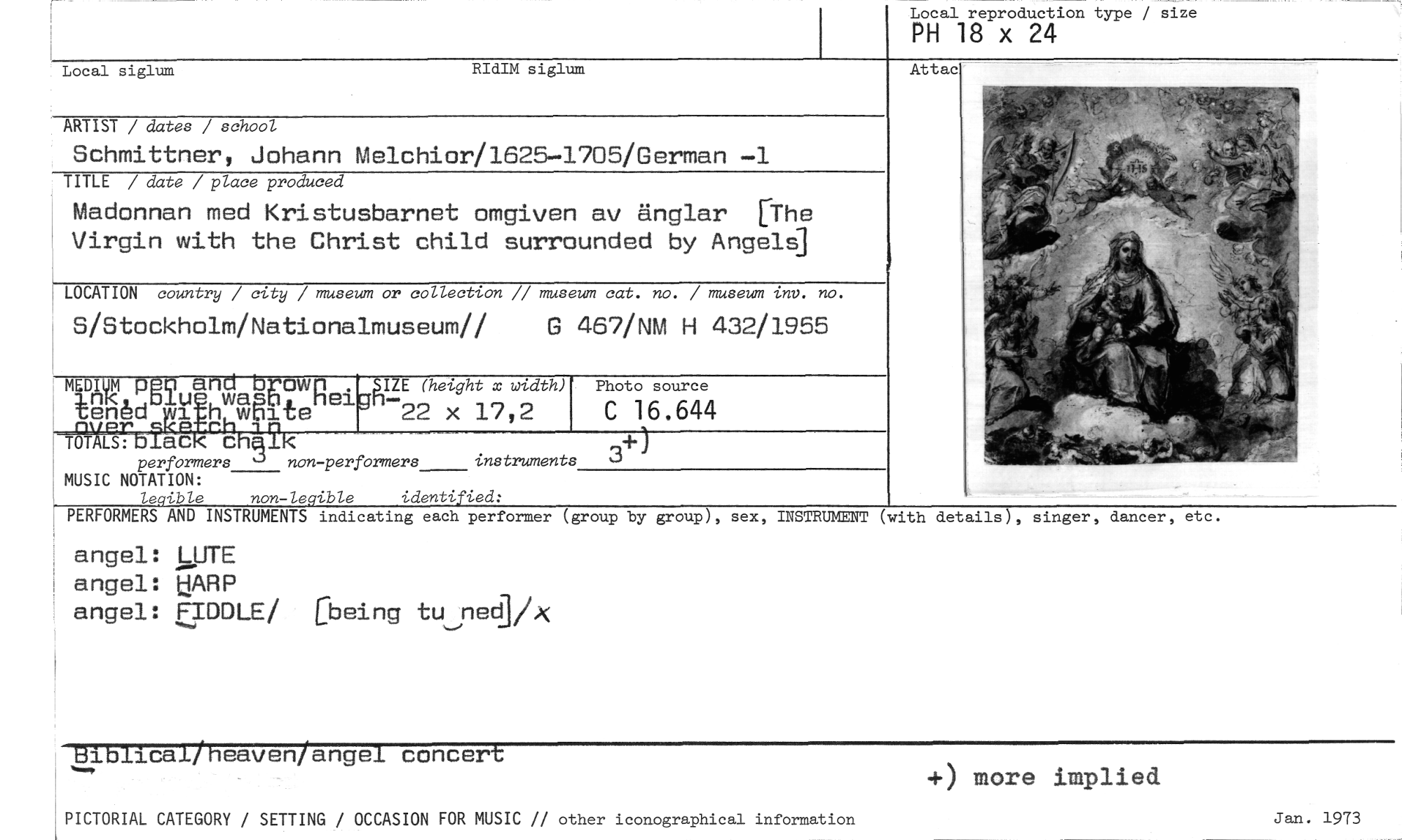 //// Local reproduction type / size //// PH 18 x 24 //// Attac //// Local siglum RIdIM siglum //// ARTIST / dates school //// Schmittner, Johann Melchior/1625-1705/German -1 //// TITLE / date / place produced //// Madonnan med Kristusbarnet omgiven av änglar [The Virgin with the Christ child surrounded by Angels] //// LOCATION country / city / museum or collection // museum cat. no. / museum inv. no. //// S/Stockholm/Nationalmuseum// G 467/NM H 432/1955 //// mEDrawR Nu (height width) Photo source //// tamedpeo and . a Aolu i .wasb tene w n woite nw:,r tc P rh, 1.10 -22 x 17,2 C 16.644 //// TOTALS:tilac chalk //// ) //// performers non-performers instruments 3 //// MUSIC NOTATION: //// legible non-LegibLe identified: //// PERFORMERS AND INSTRUMENTS indicating each performer (group by group), sex, //// angel: LUTE angel: UARP angel: FIDDLE/ Cbeing tu-lett/K //// INSTRUMENT (with details), singer, dancer, etc. //// Biblical heaven/ angel concert +) more implied //// PICTORIAL CATEGORY / SETTING / OCCASION FOR MUSIC // other iconographical information //// Jan. 1973 ////