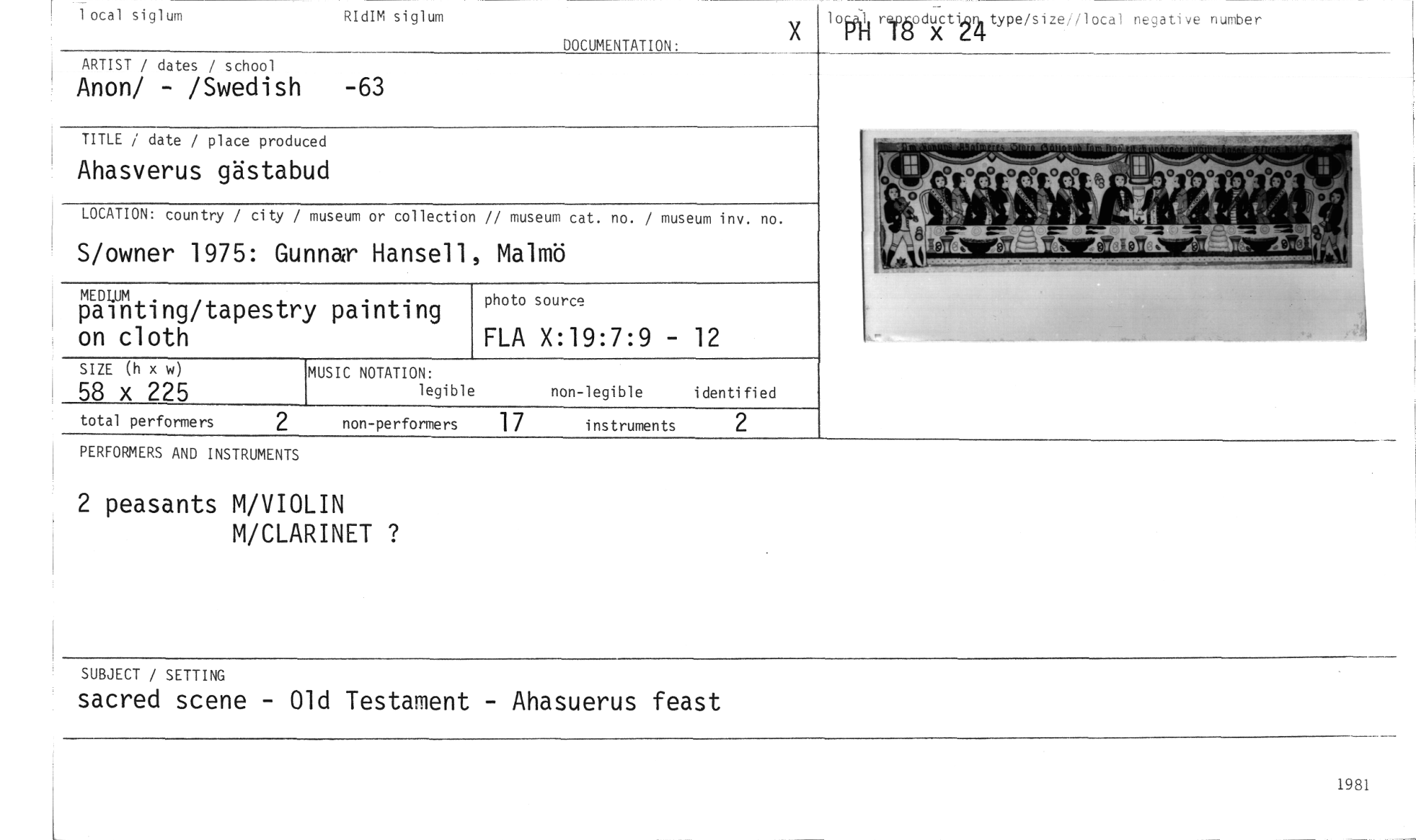 //// 1 ocal siglum RIdIM siglum //// DOCUMENTATION: //// x lotpå relpekti22type/sizenlocal negative nutuber //// ARTIST / dates / school //// Anon/ - /Swedish -63 //// TITLE / date / place produced //// Ahasverus gästabud //// LOCATION: country / city / museum or collection // museum cat. no. / museum inv. no. //// S/owner 1975: Gunnar Hansell, Malmö //// MEDIUM //// painting/tapestry painting on cloth //// photo source //// FLA X:19:7:9 - 12 //// SIZE (h x w) //// 58 x 225 //// MUSIC NOTATION: //// legible //// non-legible identified //// total performers 2 non-performers 17 instruments 2 //// PERFORMERS AND INSTRUMENTS //// 2 peasants M/VIOLIN //// M/CLARINET ? //// SUBJECT / SETTING //// sacred scene - Old Testament - Ahasuerus feast //// 1981 ////
