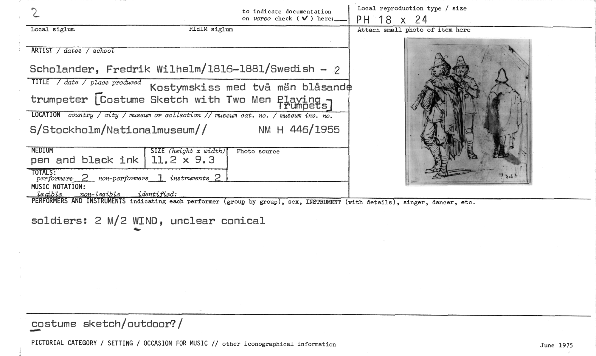 //// to indicate documentation on verso check (%1 ) //// Local reproduction type / size //// PH 18 x 24 //// Local siglum RIdIM siglum //// Attach small photo of item here //// ARTIST / dates / school. //// Scholander, Fredrik Wilhelm/1616-1881/Swedish — 2 //// trumpeter [iostume Sketch with Two //// TITLE / date / place produced Kostymskiss med //// Men Trumspets] //// två män blåsand //// LOCATION country / city / museum or collection // museum ca t. no. / museum inv. no. //// S/Stockholm/Nationalmuseum// NM H 446/1955 //// MEDIUM //// pen and black ink //// perfbrmers 2 non-perfbrmers__1 instruments 2 //// MUSIC NOTATION: //// lecible non-leaible identified: //// PERFORMERS AND INSTRUMENTS indicating each performer (group by group), sex, INSTRUMENT //// soldiers: 2 M/2 WIND, unclear conical //// SIZE (height x width) //// 11.2 x 9.3 //// Photo source //// (with details), singer, dancer, etc. //// costume sketch/outdoor7/ //// PICTORIAL CATEGORY / SITTING / OCCASION FOR MUSIC // other iconographical information //// June 1975 ////