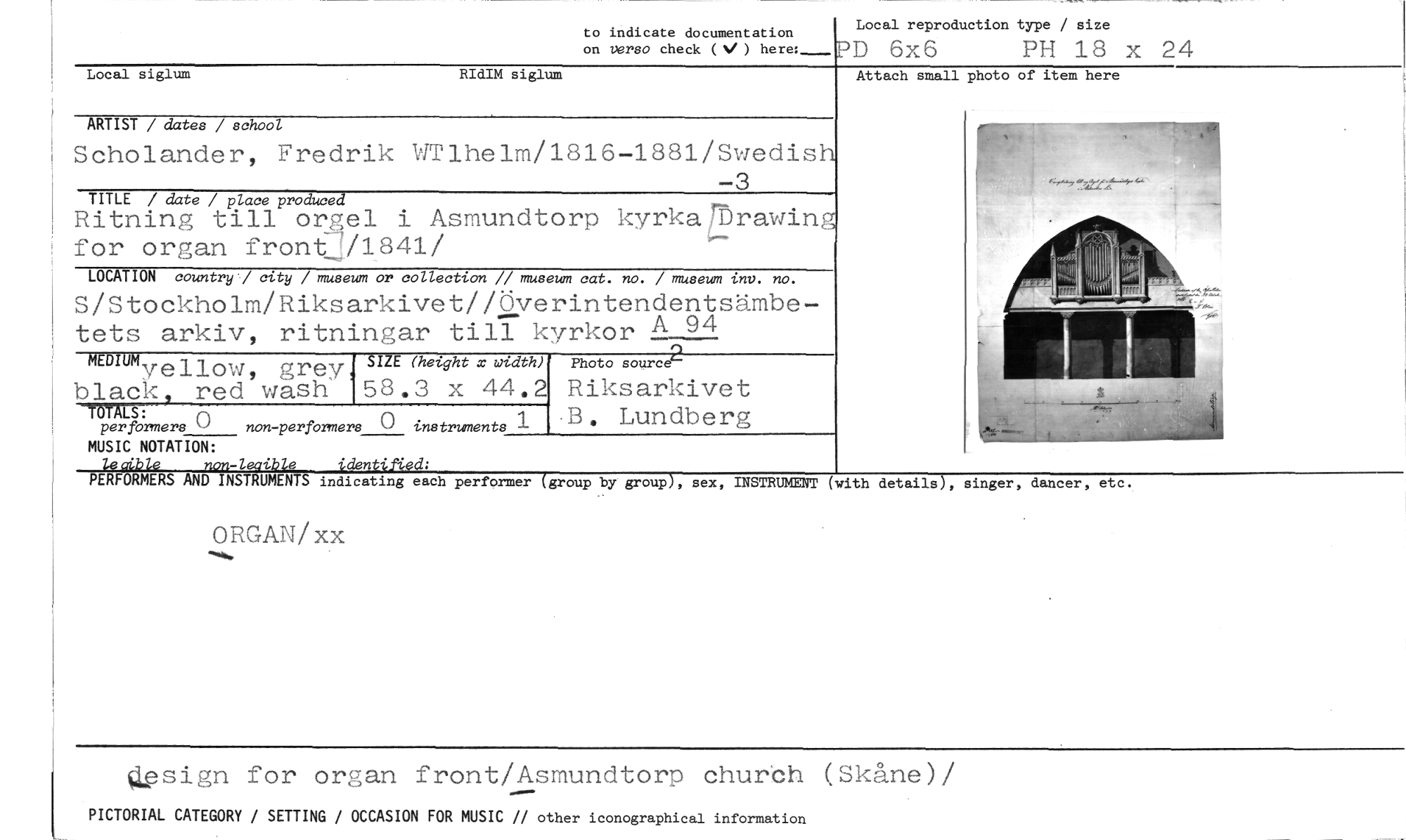 //// to indicate documentation on versa check (V ) //// PD 6x6 RH 18 x 24 //// Local reproduction type / size //// Local siglum RIdIM siglum //// Attach small photo of item here //// TITLE / date / place produced //// Ritning till orgel i Asmundtorp kyrkajprawing for organ front/1841/ //// LOCATION country] city / museum or collection // museum cat. no. / museum imv. no. //// S/Stockholm/Riksarkivet//Överintendentsämbetets arkiv, ritningar till kyrkor A 94 //// SIZE (height x wuith) //// 58.3 x 44.2 //// TOTALS: //// per formers non-performers C) instruments 1 //// MUSIC NOTATION: //// 146ible non-legible identifUd; //// PERFORMERS AND INSTRUMENTS indicating each performer (group by group), sex, INSTRUMENT //// ORGAN/xx //// ARTIST / dates / school //// Scholander, Fredrik WTlhelrn/1816-1881/Swedisl //// -3 //// MDIUMyellow, grey black, red wash //// Photo sourc //// Riksarkivet //// B. Lundberg //// (with details), singer, dancer, etc. //// gpsign for organ front/Asmundtorp churCh (Skåne)/ //// PICTORIAL CATEGORY / SETTING / OCCASION FOR MUSIC // other iconographical information ////