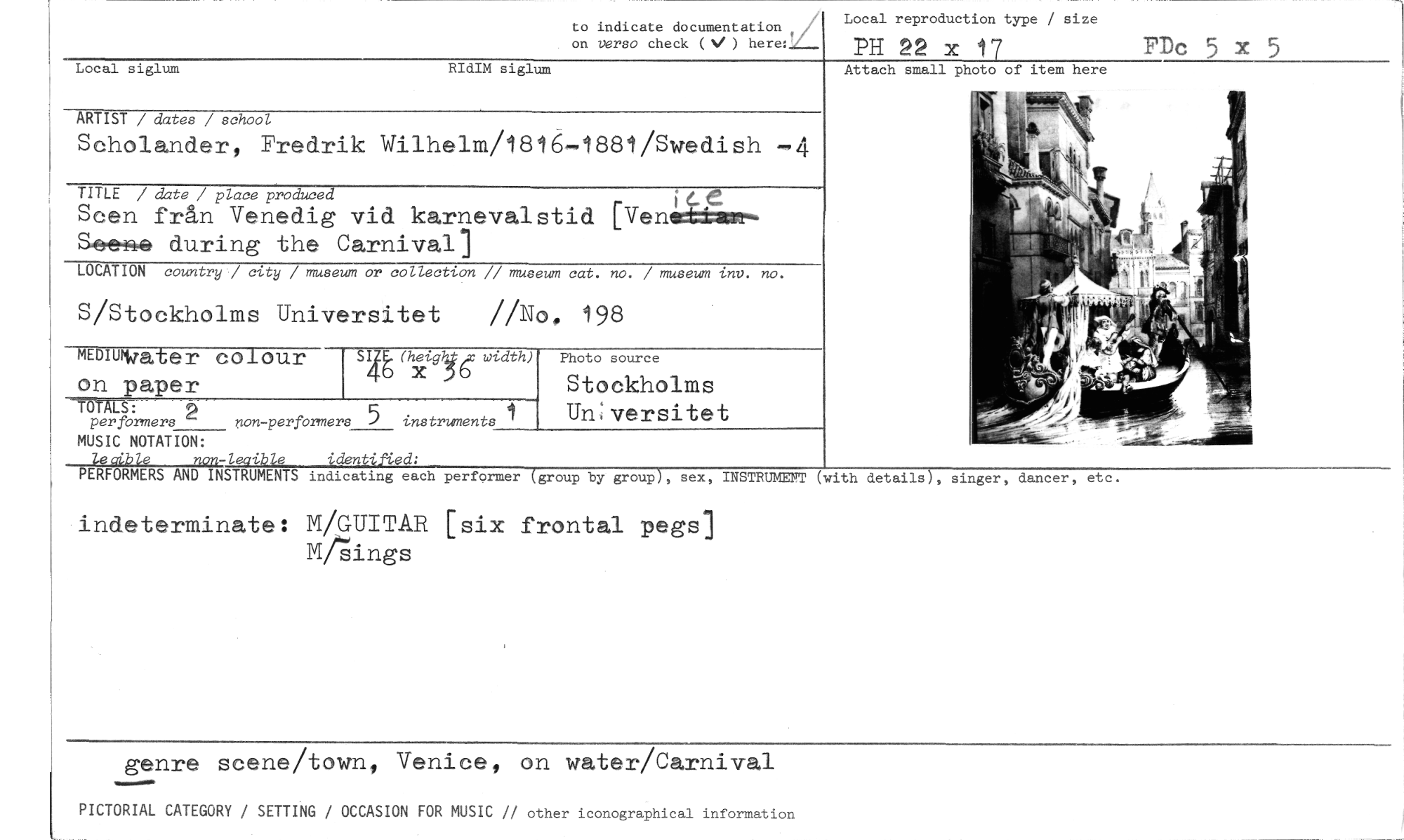 //// to indi care documentation //// / Local reproduction type / size //// on verso check (N/ ) 7' PH 22 x 17 //// FDc 5 x 5 //// Attach small photo of item here //// Local siglum RIdIM siglum //// ARTIST / dates / school //// Scholander, Fredrik Wilhelm/1816-1881/Swedish —4 //// TITLE / date / place produced //// Scen från Venedig vid karnevalstid [Ven Sc-c during the Carnival] //// LOCATION country / city / museum or collection // museum cat. no. / museum inv. no. //// S/Stockholms Universitet //No, 198 //// Photo source //// on paper //// STALS: //// per formers 2 non-perfermers 5 instruments 1 //// MUSIC NOTATION: //// leaible non-leaible identified: //// jritlers //// minurigater colour //// 4t (gb,k ,x width) , xhei //// Stockholms Universitet //// PERFORMERS AND INSTRUMENTS indicating each performer (group by group), sex, INSTRUMENT (with details), singer, dancer, etc. //// indeterminate: M/GUITAR [six frontal pegs] M/tings //// genre scene/town, Venice, on water/Carnival //// PICTORIAL CATEGORY / SETTING / OCCASION FOR MUSIC // other iconographical information ////