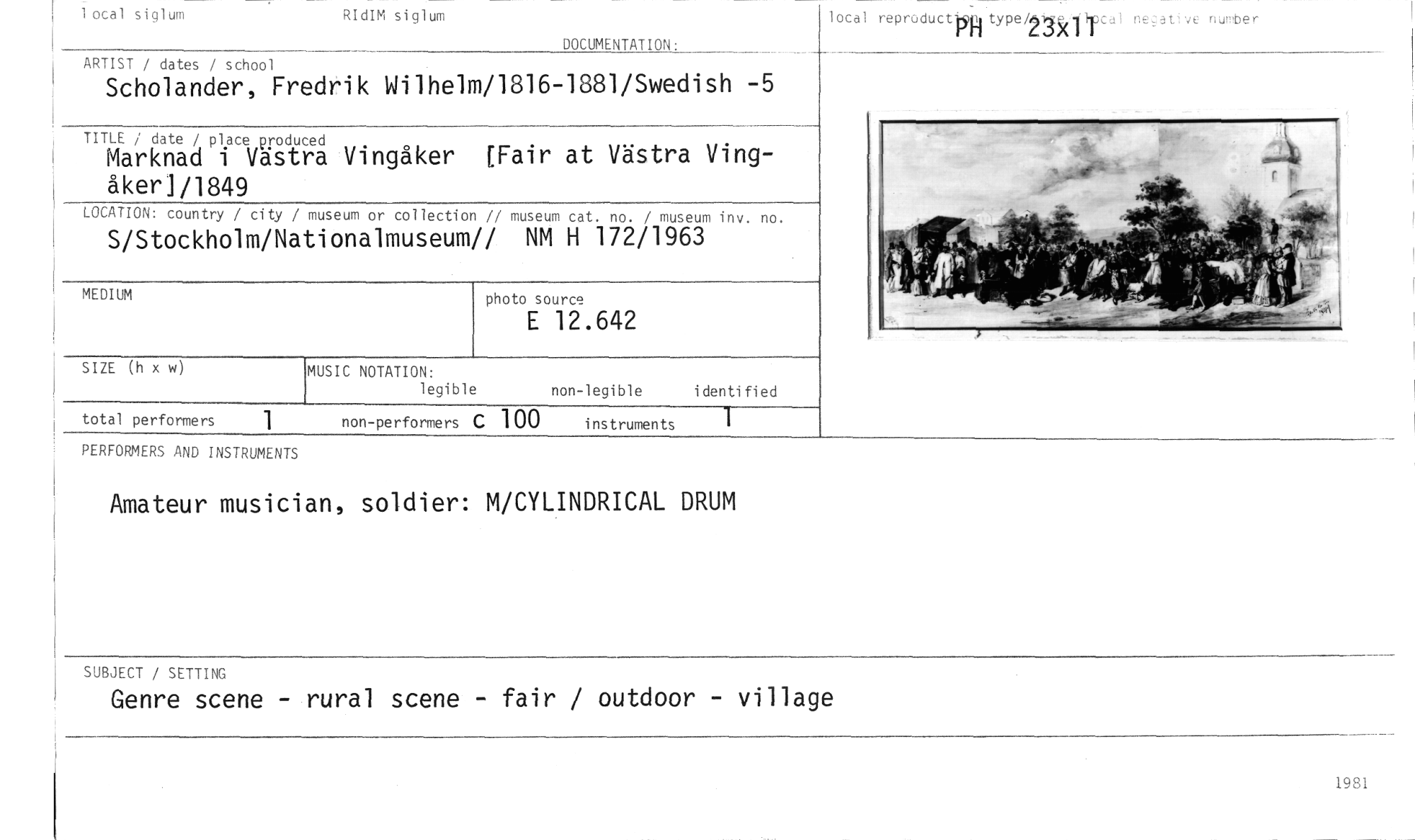 //// local siglum RIdIM siglum //// DOCUMENTATION: //// lotal reproductki type/2-1mIsca, negative number //// ARTIST / dates / school //// Scholander, Fredrik Wilhelm/1816-1881/Swedish -5 //// TITLE date / place produced //// Marknad i Vastra Vingåker [Fair at Västra Vingåker1/1849 //// LOCATION: country / city / museum or collection // museum cat. no. / museum inv. no. //// S/Stockholm/Na tionalmuseum// NM H 172/1963 //// MEDIUM photo source //// E 12.642 //// SIZE (h x w) MUSIC NOTATION: identified //// legible non-legible //// total performers 1 non-performers C 100 instruments 1 //// PERFORMERS AND INSTRUMENTS //// Amateur musician, soldier: M/CYLINDRICAL DRUM //// SUBJECT / SETTING //// Genre scene - rural scene - fair / outdoor - village //// 1981 ////