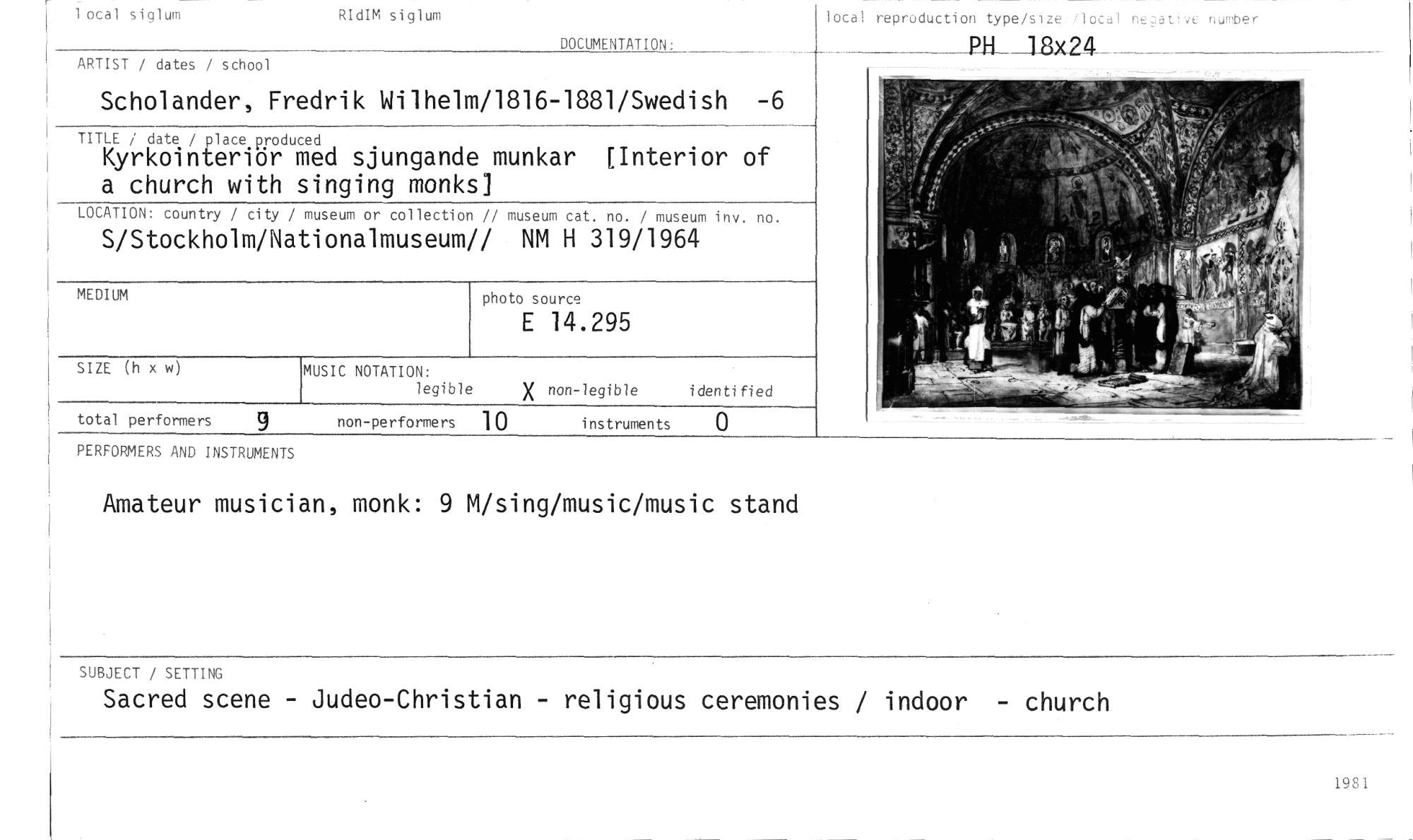 //// 1 ocal siglum RIdIM siglum //// lotal reproduction type/size /kcal negative nurober //// PH 1Rx24 //// DOCUMENTATION //// ARTIST / dates / school //// Scholander, Fredrik Wilhelm/1816-1881/Swedish -6 //// TITLE / date / place produced //// Kyrkointeriör med sjungande munkar (Interior of a church with singing monks] //// LOCATION: country / city / museum or collection // museum cat. no. / museum inv. no. //// S/Stockholm/Nationalmuseum// NM H 319/1964 //// MEDIUM photo source //// E 14.295 //// SIZE (h x w MUSIC NOTATION: X non-legible identified //// legible //// total performers 9 non-performers 10 instruments 0 //// PERFORMERS AND INSTRUMENTS //// Amateur musician, monk: 9 M/sing/music/music stand //// SUBJECT / SETTING //// Sacred scene - Judeo-Christian - religious ceremonies / indoor - church //// 1981 ////
