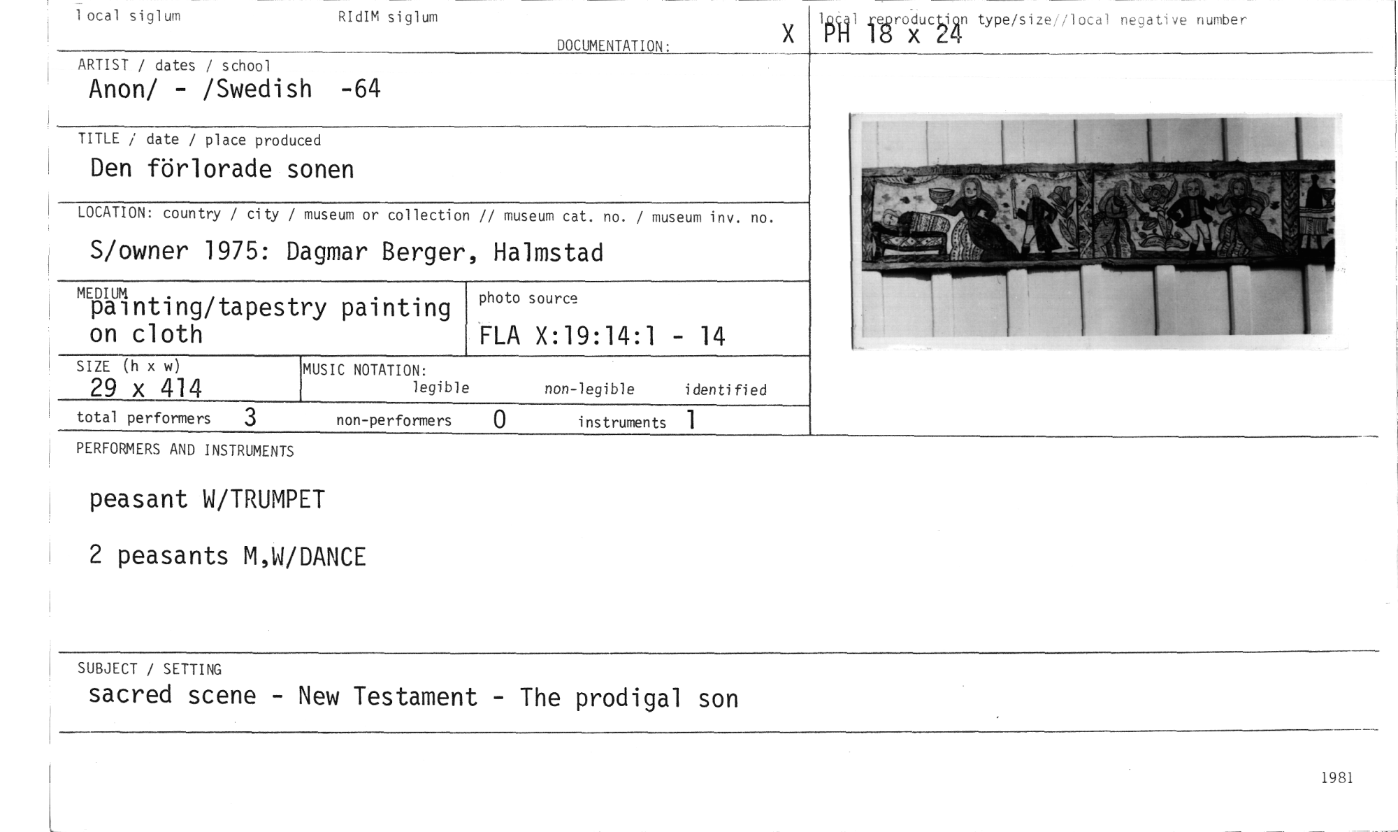 //// PERFORMERS AND INSTRUMENTS //// peasant W/TRUMPET //// 2 peasants M,W/DANCE //// SUBJECT / SETTING //// sacred scene - New Testament - The prodigal son //// 199.1 //// 3 //// non-performers //// instruments 1 //// total performers //// X IN] 4wroduct„;Li2n type/size//local negative nutuber I ö X ti //// DOCUMENTATION: //// ARTIST / dates / school //// Anon/ - /Swedish -64 //// TITLE / date / place produced //// Den förlorade sonen //// LOCATION: country / city / museum or collection // museum cat. no. / museum inv. no. //// S/owner 1975: Dagmar Berger, Halmstad //// MEDIUM . //// painting/tapestry painting on cloth //// SIZE (h x w) //// 29 x 414 //// MUSIC NOTATION: //// legible //// non-legible i denti fi ed //// RIdIM siglum //// 1 ocal siglum //// photo source //// FLA X:19:14:1 - 14 ////