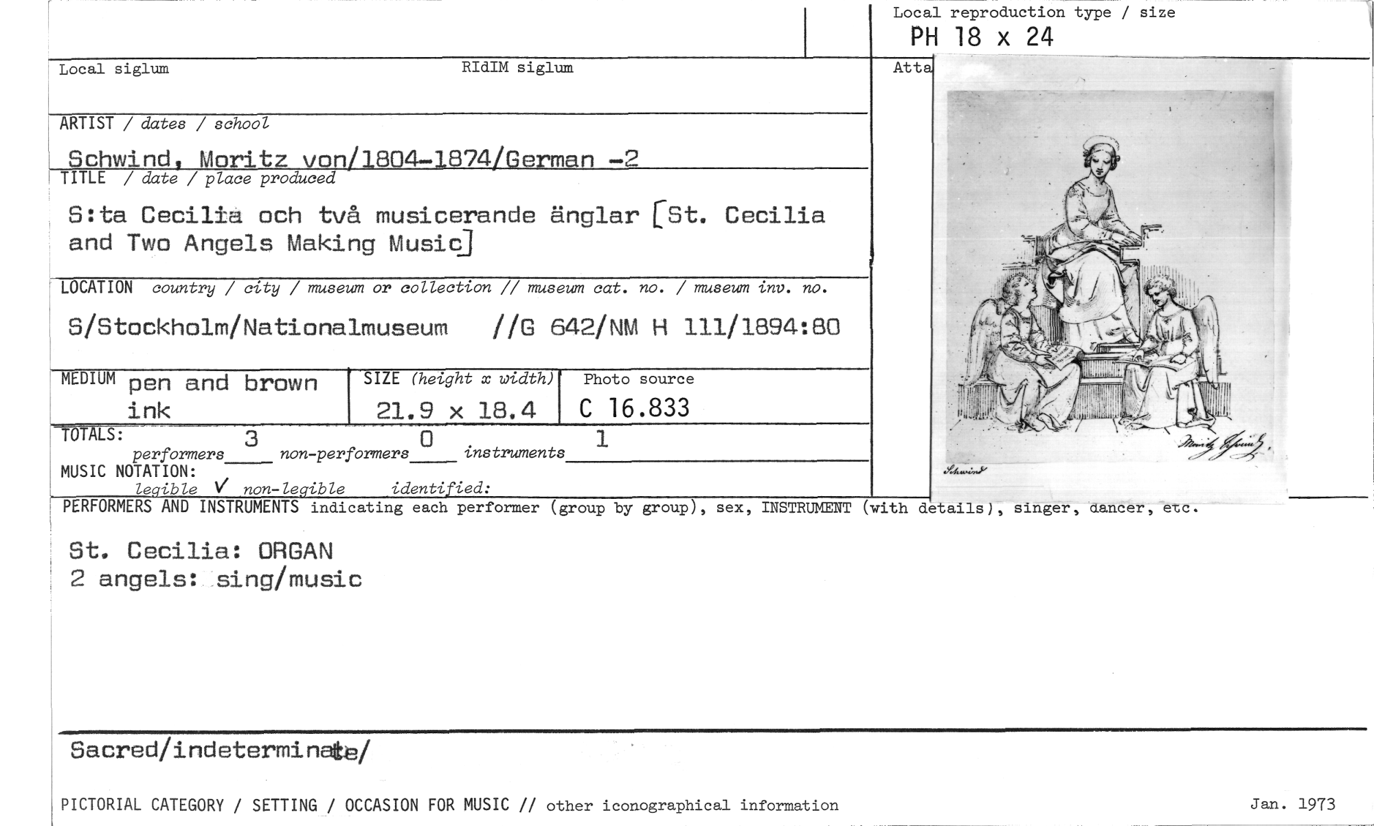 //// Loca. //// PV //// Local siglum RIdIM siglum Atta //// ARTIST / dates / school //// Schwind, Moritz von/1804-1874/German —2 //// TITLE / date / place produced //// S:ta Cecilia och två musicerande änglar [St. Cecilia and Two Angels Making Music] //// LOCATION country / city / museum or collection // museum cat. no. / museum inv. no. //// S/Stockholm/Nationalmuseum //G 642/NM H 111/1894:80 //// MEDIUM pen and brown ink SIZE (height x width) Photo source //// 21.9 x 18.4 C 16.833 //// MÅLS: 3 0 1 //// performers non-performers instruments //// MUSIC NOTATION: //// legible V non-legible identified: //// .,, r.,fl,,, , — //// reproduction type / size //// 18 x 24 //// in ica ing eac. per_ (group group ygroup' ___ //// , sex, (with ea s,snger, daner, ezc. //// St. Cecilia: ORGAN //// 2 angels: sing/music //// Sacred/indeterminat/ //// PICTORIAL CATEGORY / SETTING / OCCASION FOR MUSIC // other iconographical information Jan. 1973 ////