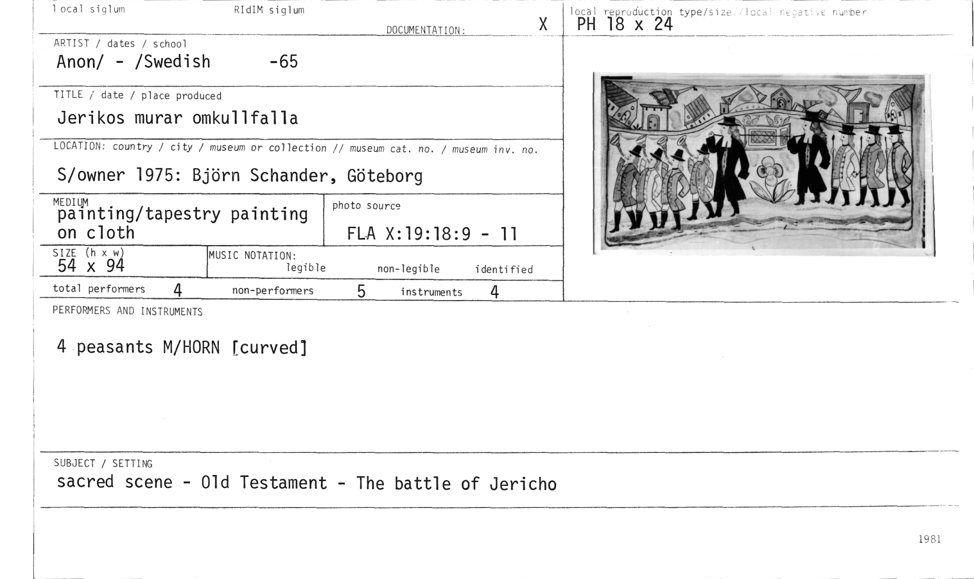 //// 1 ocal siglum RIdIM siglum //// DOCUMENTATION• //// lotal reproduction type/size»lbcal negative number //// PH 18 x 24 //// ARTIST / dates / school //// Anon/ - /Swedish -65 //// TITLE / date / place produced //// Jerikos murar omkullfalla //// LOCATION: country / city / //// museum or collection // museum cat. no. / museum inv. no. //// S/owner 1975: B //// örn Schander, Göteborg //// MEDIUM //// painting/tapestry painting on cloth //// photo source //// FLA X:19:18:9 - 11 //// SIZE (h x w) //// 54 x 94 //// MUSIC NOTATION: //// legible non-legible identified //// total performers //// instruments //// non-performers //// 4 //// 4 //// 5 //// PERFORMERS AND INSTRUMENTS //// 4 peasants M/HORN [turved] //// SUBJECT / SETTING //// sacred scene - Old Testament - The battle of Jericho //// 1981 ////