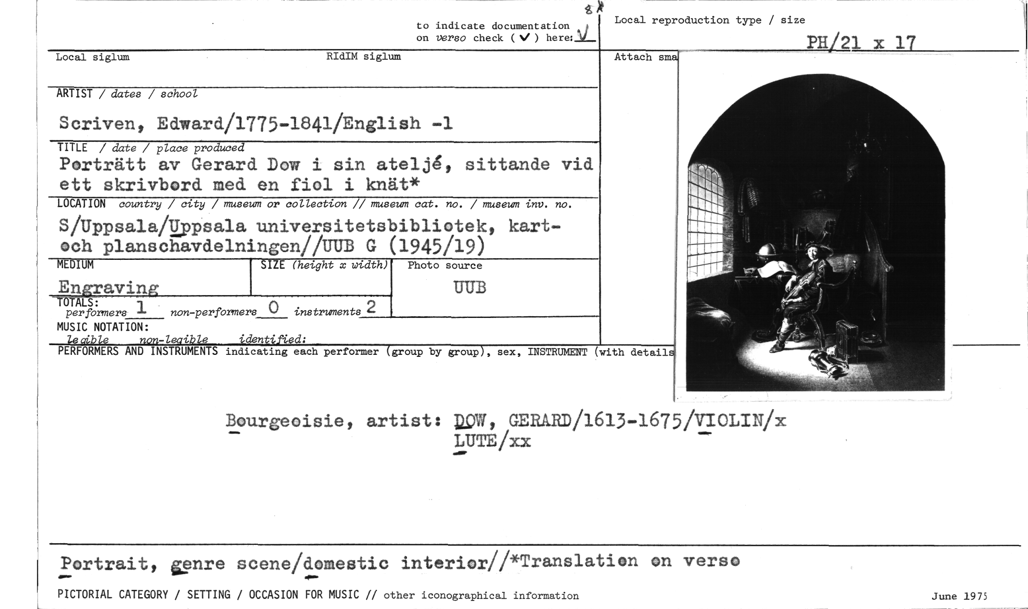 //// to indicate documentation k //// on verso check (N., ) here:V //// Local reproduction type / size //// PH/21 x 17 //// Local siglum RIdIM siglum //// Attach sma //// ARTIST / dates / school //// Scriven, Edward/1775-1841/English -1 //// TITLE / date / place produced //// Porträtt av Gerard Dow i sin ateljg, sittande vid ett skrivbord med en fiol i knät* //// LOCATION country / city / museum or collection // museum cat. no. / museum inv. no. //// S/Uppsala/Mppsala universitetsbibliotek, kart-och planschavdelningen/PUB G (1945/19) //// MEDIUM SIZE (height x width) Photo source //// Engraving UUB //// -MALS: //// per i formers non-per formers 0 instruments //// MUSIC NOTATION: //// non-leaible identified: //// PERFORMERS AND INSTRUMENTS indicating each performer (group by group), sex, INSTRUMENT //// Bourgeoisie, artist: WW, GERARD/1613-1675/VIOLIN/x //// LUTE/xx //// Portrait, genre scene/domestic interior//*Translation on verso June 1975 //// PICTORIAL CATEGORY / SETTING / OCCASION FOR MUSIC // other iconographical information ////
