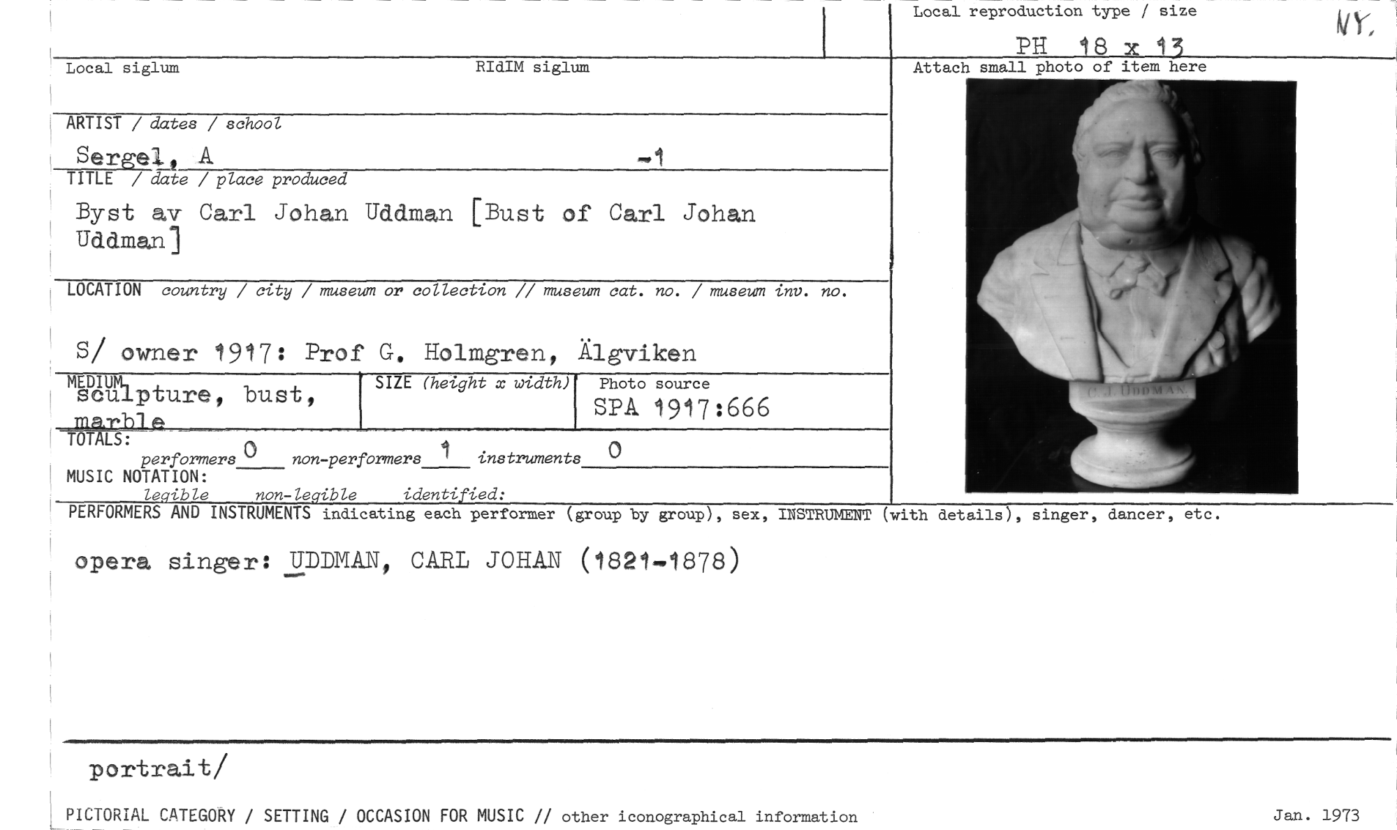 //// Local siglum RIdIM siglum //// ARTIST / dates / school //// Sergel, A -1 //// TITLE / date / place produced //// Byst av Carl Johan Uddman [Bust of Carl Johan Uddman] //// LOCATION country / city / museum or collection // museum cat. no. / museum inv. no. //// S/ owner 1917: Prof G. Holmgren, Älgviken //// MEDIUNL //// scuipture, bust, //// m^rh144 //// TOTALS: //// performers ° non-performers 1 instruments //// MUSIC NOTATION: //// legible non-leqible identified: Local reproduction type / size VY, //// PH 18 x 13 //// Attach small photo of item here //// 1 //// SIZE (hetght x width) Photo source //// SPA 1917:666 //// PERFORMERS AND INSTRUMENTS indicating each performer (group by group), sex, INSTRUMENT (with details), singer, dancer, etc. //// opera singer: UDDMAN, CARL JOHAN (1821-1878) //// portrait/ //// PICTORIAL CATEGORY / SETTING / OCCASION FOR MUSIC // other iconographical information //// Jan. 1973 ////