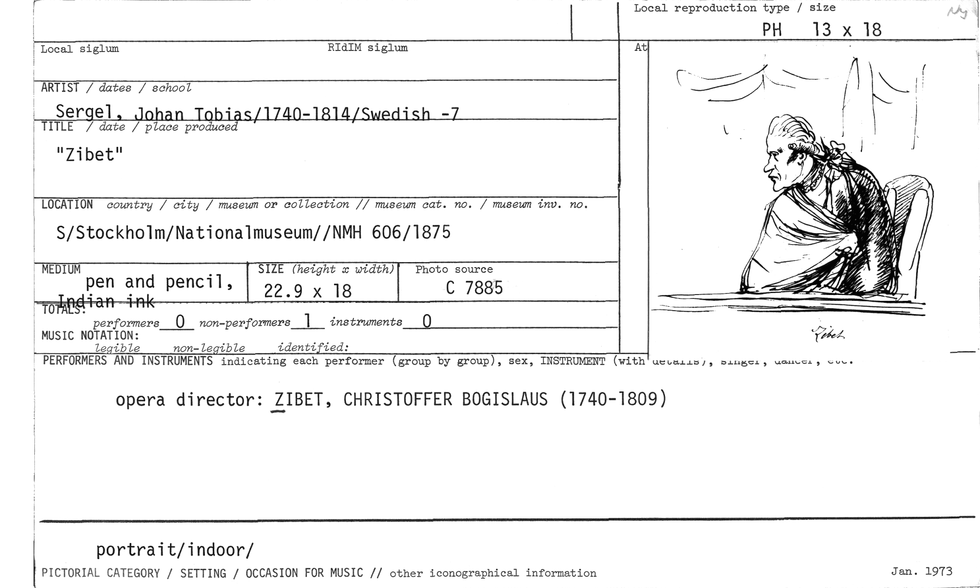 //// opera director: ZIBET, CHRISTOFFER BOGISLAUS (1740-1809) //// portrait/indoor/ Jan. 1973 //// PICTORIAL CATEGORY / SETTING / OCCASION FOR MUSIC // other iconographical information //// Local reproduction type / size //// PH 13 x 18 //// Local siglum RIdIM siglum //// Sergel, Johan Tohia/1740-1214/Swedish -7 //// TITLE / date / place produced //// "Zibet" //// LOCATION country / city / museum or collection // museum cat. no. / museum tnv. no. //// S/Stockholm/Nationalmuseum//NMH 606/1875 //// MEDIUM //// pen and pencil, //// parformers 0 non-parformers 1 instruments 0 MUSIC NOTATION: --- //// legible non -legible identified: //// PERFORMERS AND INSTRUMENTS indicating each performer (group //// TO //// by group), sex, INSTRUMENT (with //// u=411.-c , ////