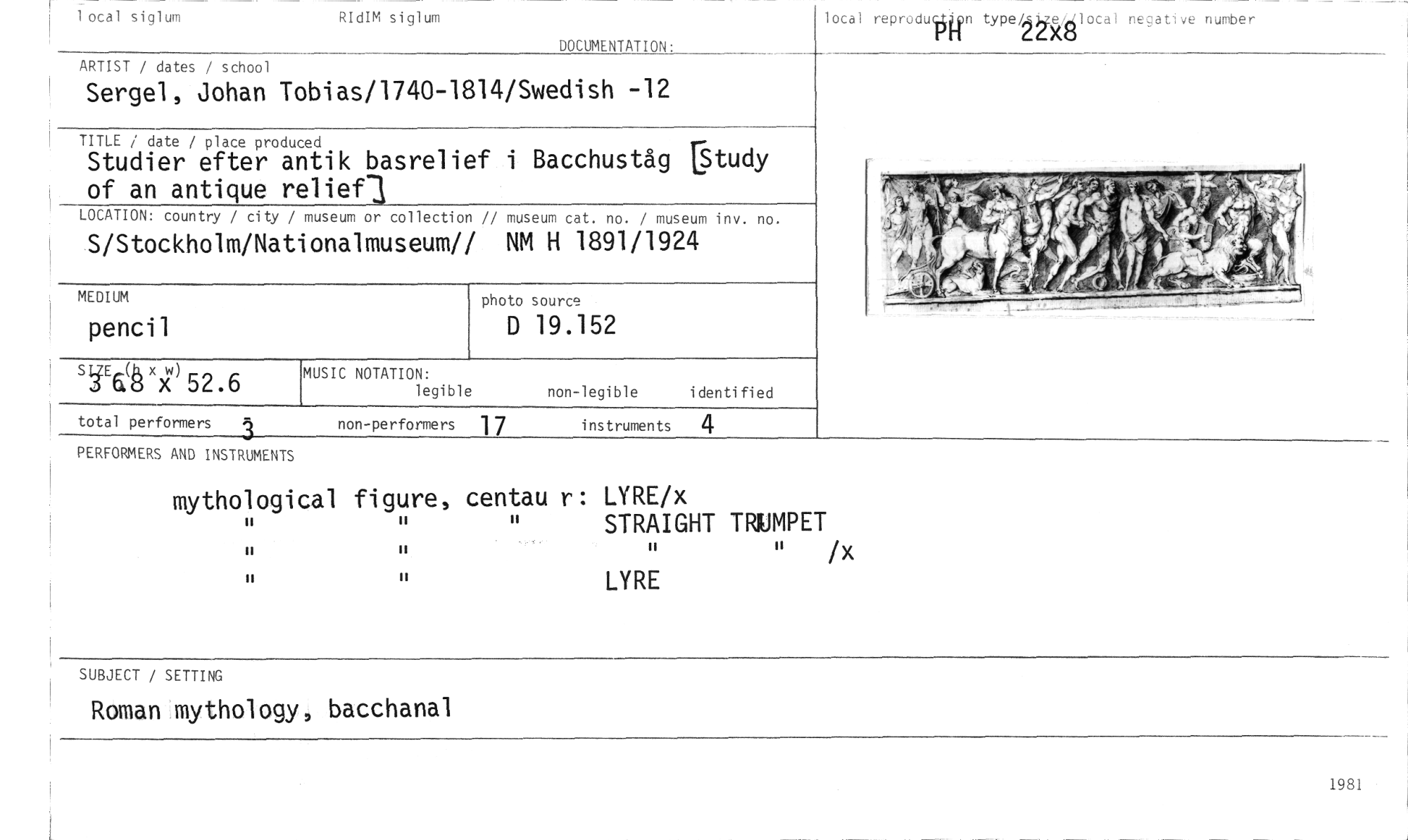 //// 1 ocal siglum RIdIM siglum //// DOCUMENTATION: //// ARTIST / dates / school //// Sergel, Johan Tobias/1740-1814/Swedish -12 //// local reprodu ffn type/LAke4,41ocal negative number //// LXiö //// //// TITLE / date / place produced //// Studier efter antik basrelief i Bacchuståg [Study //// of an antique //// LOCATION: country / city / museum or collection // museum cat. no. / museum inv. no. //// S/Stockholm/Nationalmuseum// NM H 1891/1924 //// MEDIUM photo source //// pencil D 19.152 //// //// //// //// äEä x)`(") 52.6 //// MUSIC NOTATION: //// legible non-legible i denti fi ed //// total performers 3 //// PERFORMERS AND INSTRUMENTS //// non-performers 17 instruments 4 //// mythological figure, centau r: LYRE/x //// H STRAIGHT TRUMPET //// " /x //// LYRE //// SUBJECT / SETTING //// Roman mythology, bacchanal //// 1981 ////