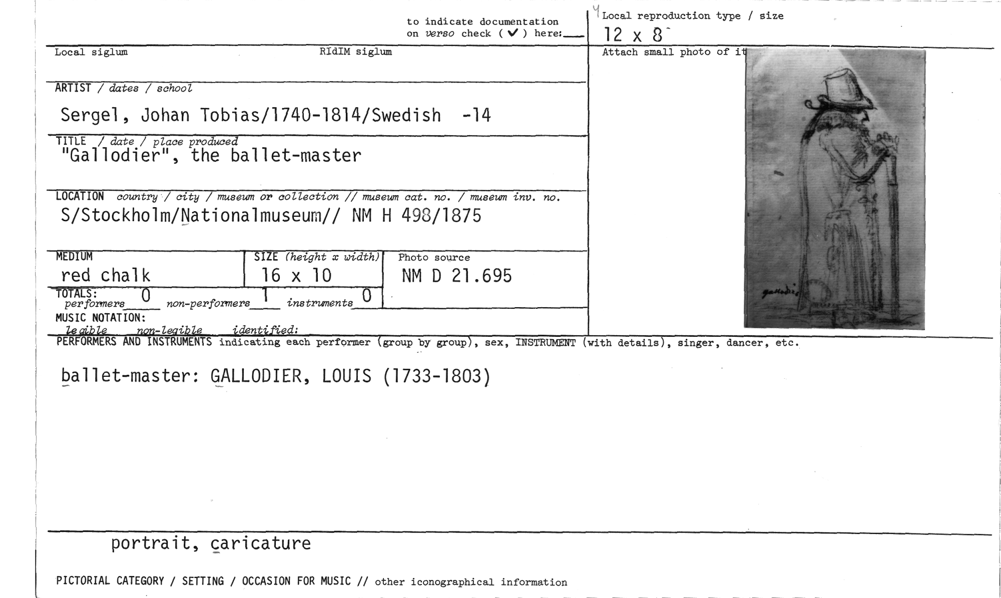 //// to indicate documentation on verso check ( I ) //// Local reproduction type / size //// 12 x 8 //// Local siglum RIdIM siglum //// Attach small photo of i //// ARTIST / dates / school //// Sergel, Johan Tobias/1740-1814/Swedish -14 //// TITLE / date / place produced //// "Gallodier", the ballet-master //// LOCATION country / city / museum or collection // museum cat. no. / museum inv. no. //// S/Stockholm/Nationalmuseum// NM H 498/1875 //// MEDIUM //// red chalk //// Photo source //// SIZE (height x width) //// 16 x 10 //// NM D 21.695 //// per formers non-perfVrmers instruments //// S: //// MUSIC NOTATION: //// non-lecible identifi<ed: //// PERFORMERS AND INSTRUMENTS indicating each performer (group by group), sex, //// INSTRUMENT (with details), singer, dancer, etc. //// ballet-master: GALLODIER, LOUIS (1733-1803) //// portrait, caricature //// PICTORIAL CATEGORY / SETTING / OCCASION FOR MUSIC // other iconographical information ////