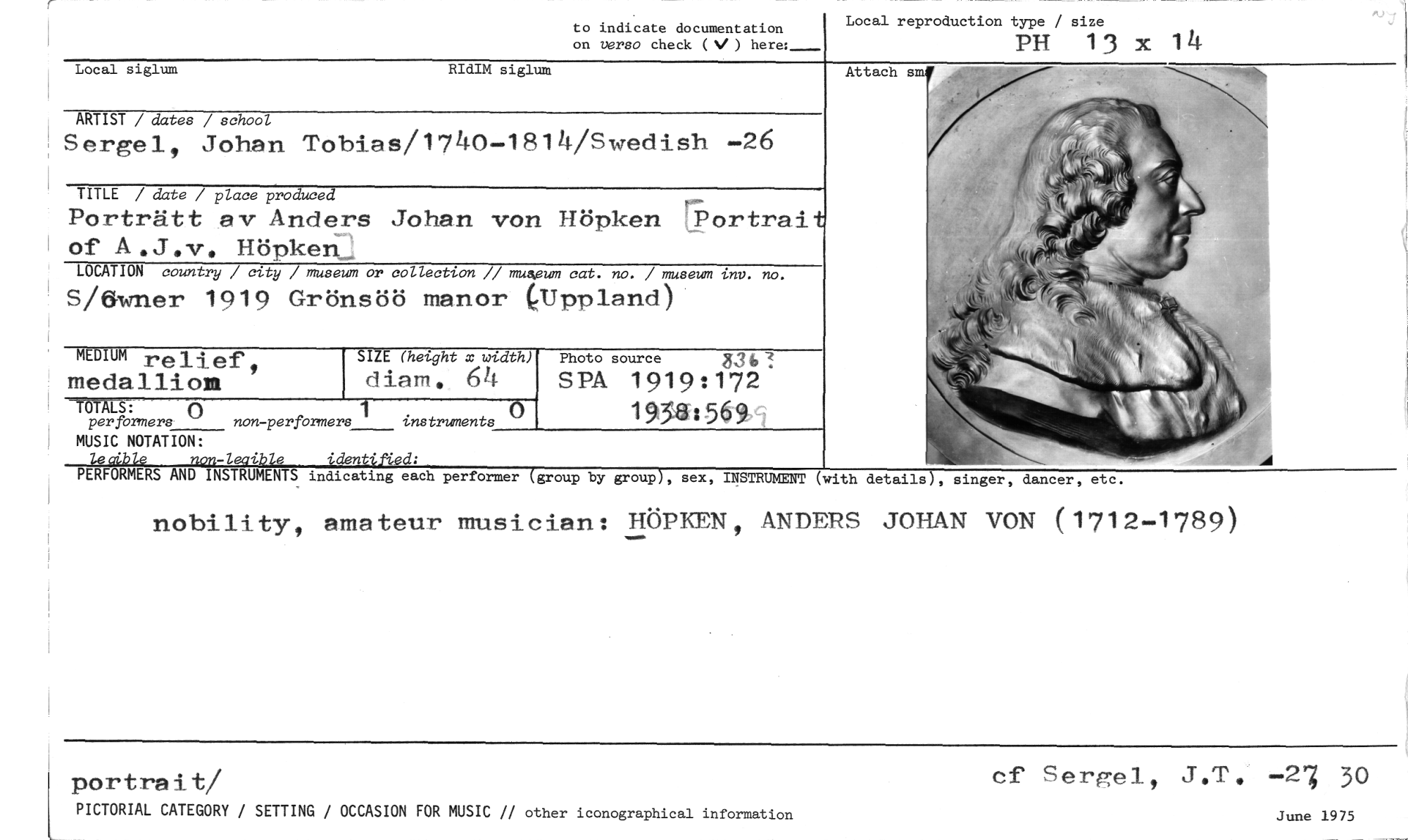 //// nobility, amateur musician: HÖPKEN, ANDERS JOHAN VON (1712-1789) //// Attach sm //// RIdIM siglum //// to indicate documentation on verso check (V ) here: //// Local reproduction type / size //// PIT 13 x 14 //// ARTIST / dates / school //// Sergel, Johan Tobias/1740-1814/Swedish -26 //// TITLE / date / place produced i-- //// Porträtt av Anders Johan von Häpken _Portrait of A.J.v. Höpken._ //// LOCATION country / city / museum or collection // museum cat. no. / museum inv. no. //// S/8-wner 1919 Grönsöö manor (Uppland) //// MEDIUM relief, //// medalliom //// TOTALS: () 1 () //// per formers non-per formers instruments //// Photo source 336-f //// SPA 1919:172 195a:569 //// SIZE (height x width) //// diam. 64 //// MUSIC NOTATION: //// looribie non-leaible identiAed: //// PERFORMERS AND INSTRUMENTS indicating each performer (group by group), sex, INSTRUMENT //// Local siglum //// (with details), singer, dancer, etc. //// /30/7tra iL ib/ //// PICTORIAL CATEGORY / SETTING / OCCASION FOR MUSIC // other iconographical information //// cf Sergel, J.T. -2'3 30 //// June 1975 ////