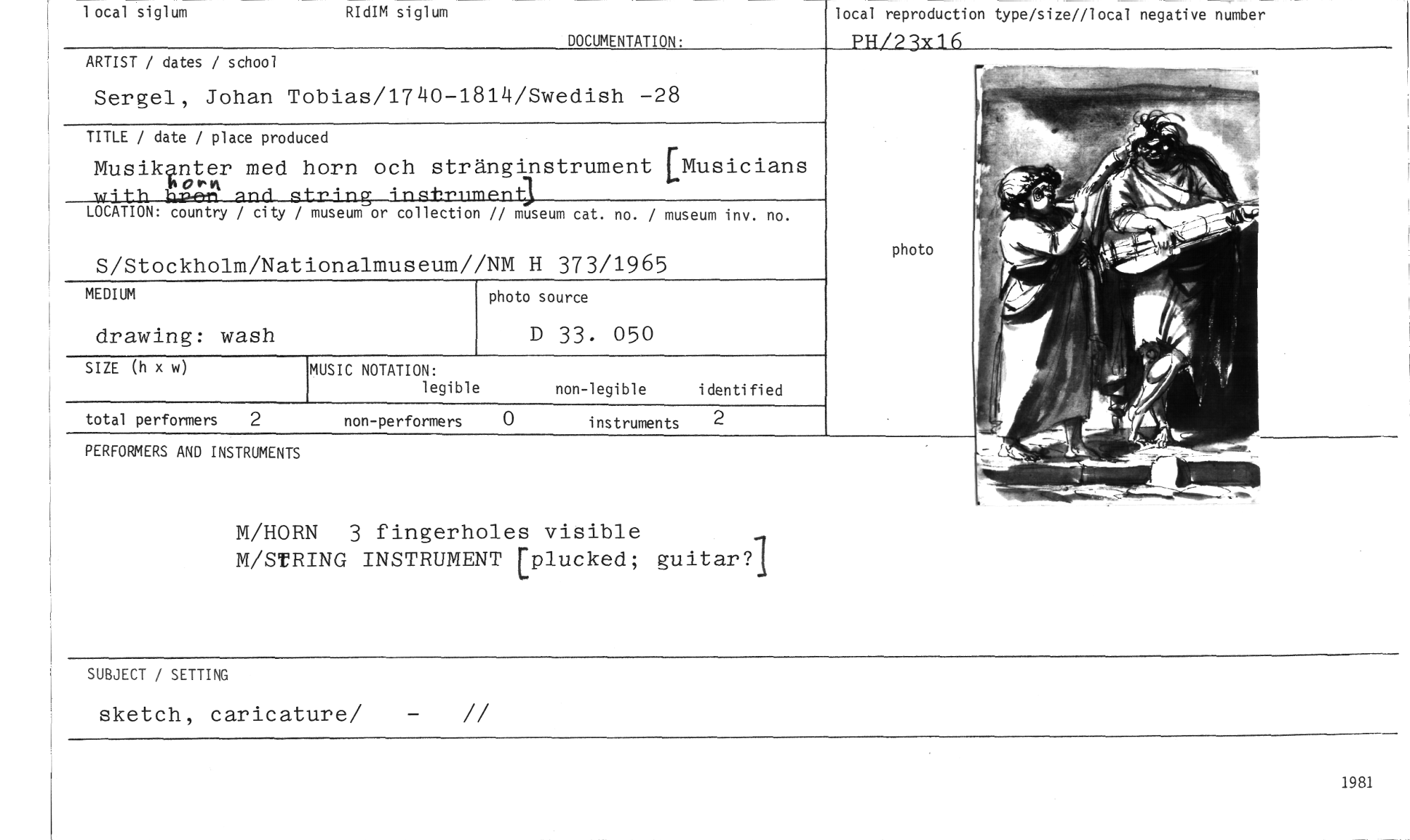 //// 1981 //// total performers 2 //// non-performers 0 instruments 2 //// 1 ocal siglum RIdIM siglum //// DOCUMENTATION. //// ARTIST / dates / school //// Sergel, Johan Tobias/1740-1814/Swedish —28 //// S/Stockholm/Nationalmuseum//NM H 373/1965 //// PERFORMERS AND INSTRUMENTS //// M/HORN 3 fingerholes visible //// M/STRING INSTRUMENT [plucked; guitari //// SUBJECT / SETTING //// sketch, caricature/ — // //// local reproduction type/size//local negative number //// PH/23x16 //// TITLE / date / place produced //// Musik?nter med horn och stränginstrument [Musicians 'IjkerrL-aad--s-t-r-tagjnstr-um-entk //// LOCATION: country / city / museum or collection // museum cat. no. / museum inv. no. //// SIZE (h x w) //// MUSIC NOTATION: //// legible //// non-legible identified //// MEDIUM //// drawing: wash //// photo source //// D 33. 050 ////