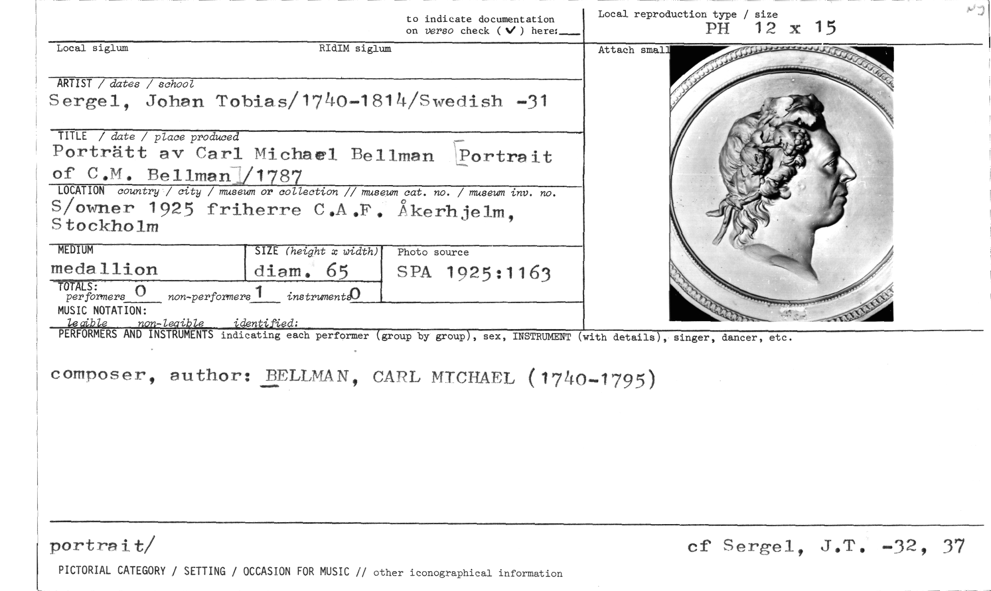 //// to indicate documentation Local reproduction type / size //// on verso check (N.e ) here:_ PH 12 x 15 //// Local siglum RIdIM siglum //// ARTIST / dates / school //// Sergel, Johan Tobias/1740-1814/Swedish -31 //// TITLE / date / place produced //// Porträtt av Carl Michael Bellman Portrait //// of C.M. Bellman,./1787 //// LOCATION country / city / museum or collection // museum cat. no. / museum inv. no. //// S/owner 1925 friherre C.A.F.;kerhjelm, Stockholm //// MEDIUM //// medallion //// -MALS: //// perfbrmers () non-perfbrmers 1 instruments() //// MUSIC NOTATION: //// lecible non-leaible identified: //// PERFORMERS AND INSTRUMENTS indicating each performer (group by group), sex, INSTRUMENT (with details), singer, dancer, etc. //// composer, author: BELLMAN, CARL MTCHAEL (1740-1795) //// SIZE (height x width) //// diam. 65 //// Photo source //// SPA 1925:1163 //// Attach smal //// portrglit/ //// PICTORIAL CATEGORY / SETTING / OCCASION FOR MUSIC // other iconographical information //// cf Sergel, J.T. -32, 37 ////