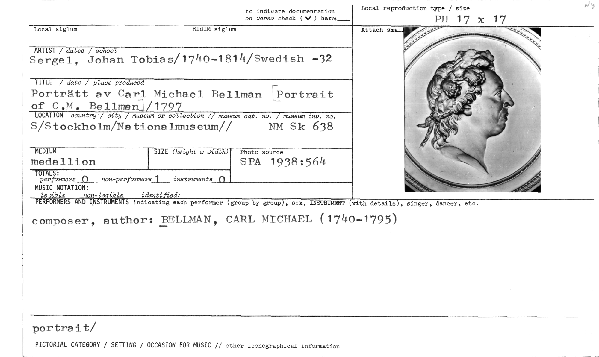 //// to indicate documentation on versa check ( I ) //// Local reproduction type / size //// PH 17 x 17 //// Attach smal //// Local siglum RIdIM siglum //// ARTIST / dates / school //// Sergel, Johan Tobias/1740-1814/Swedish -32 //// TITLE / date / place produced //// Porträtt av Carl Michael Bellman IPortrait //// of C.M. Bellman]/1'791 //// LOCATION country / city / museum or collection // museum cat. no. / museum inv. no. //// S/Stockholm/Nationalmuseum// NM Sk 638 //// MEDIUM //// medallion SIZE (height x width) //// Photo source //// SPA 1938:564 //// -TOTALS: //// performere__O___ non-performersj_ instruments_D MUSIC NOTATION: //// l9 401e non-Zeaible identified: //// PERFORMERS AND INSTRUMENTS indicating each performer (group by group), sex, INSTRUMENT (with details), singer, dancer, etc. //// composer, author: BELLMAN, CARL MICHAEL (1740-1795) //// portrai_lb// //// PICTORIAL CATEGORY / SETTING / OCCASION FOR MUSIC // other iconographical information ////