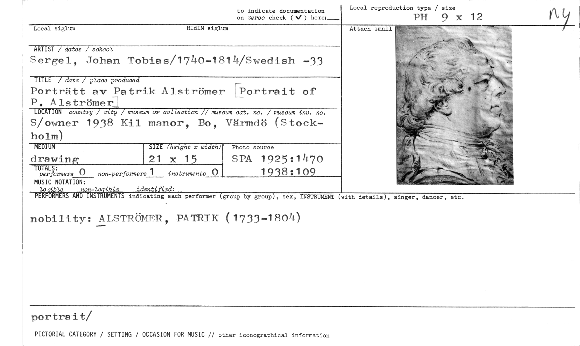 //// Local reproduction type / size //// PH 9 x 12 //// Attach small //// to indicate documentation //// on verso check (V ) here:_ //// Local siglum RIdIM siglum //// ARTIST / dates / school //// Sergel, Johan Tobias/1740-1814/Swedish -3 //// TITLE / date / place produced //// Porträtt av Patrik Alströmer P-ortrait of P. Alströmer. //// LOCATION country / city / museum or collection // museum cat. no. / museum inv. no. //// S/owner 1938 Kil inanor, Bo, Värmdö (Stockholm) //// MEDIUM //// d rawing //// per formers () non-performers 1 instruments () //// MUSIC NOTATION: //// lecible non-leaible identified: //// PERFORMERS AND INSTRUMENTS indicating each performer (group by group), sex, INSTRUMENT (with details), singer, dancer, etc. //// nobility: ALSTRöMER, PATRIK (1733-180"l) //// portrait/ //// PICTORIAL CATEGORY / SETTING / OCCASION FOR MUSIC // other iconographical information //// SIZE (height x width) //// 21 x 1 //// Photo source //// SIDA 1925:1470 //// 1938:109 ////