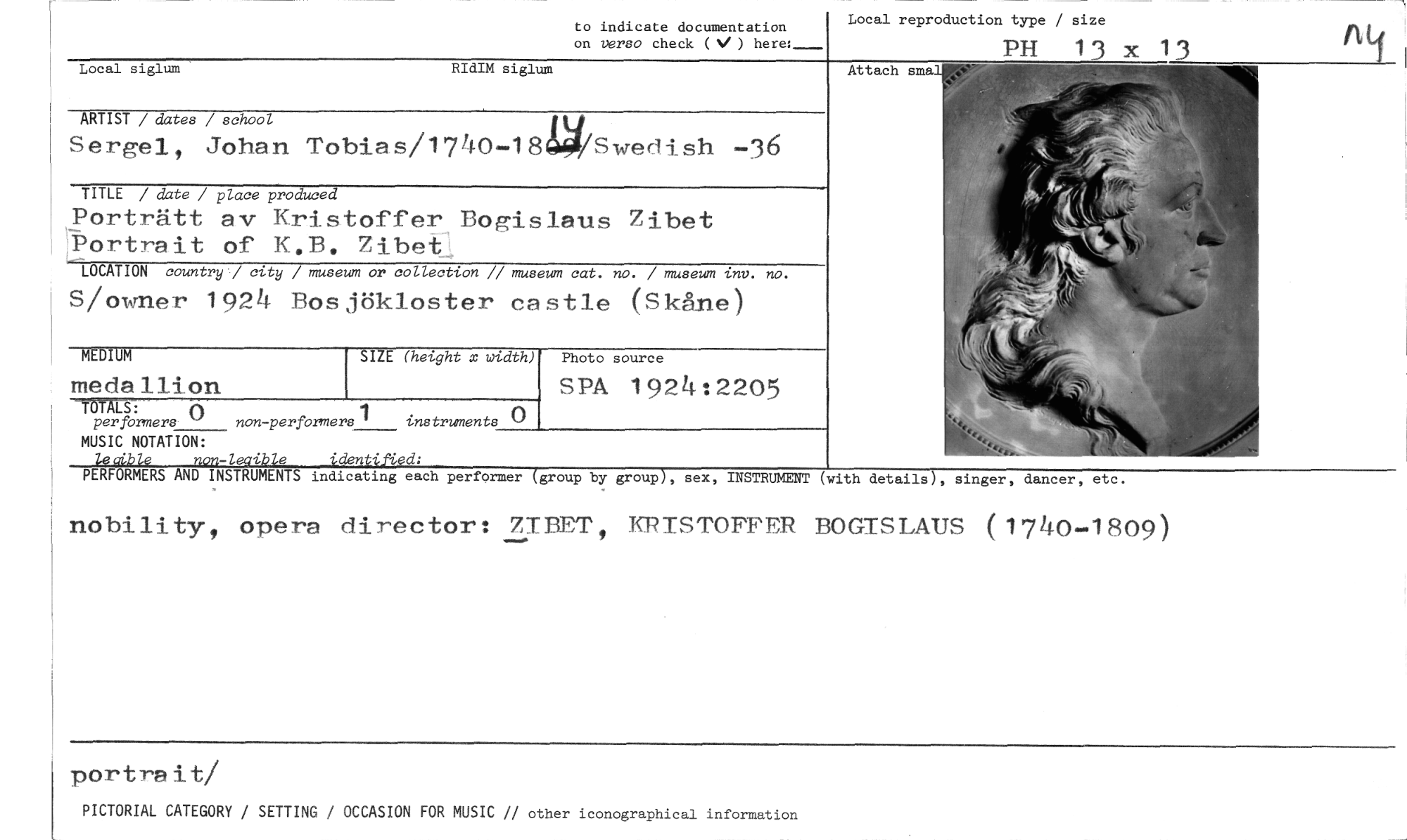 //// MUSIC NOTATION: //// Zeaible non4egible identified: //// PERFORMERS AND INSTRUMENTS indicating each performer (group by group), sex, INSTRUMENT (with //// to indicate documentation //// on verso check ( ) here:___ //// Local siglum RIdIM siglum //// ARTIST / dates / school //// Sergel, Johan Tobias/1740-1844/Swedish -36 //// TITLE / date / place produced //// Porträtt av Kristoffer Bogislaus Zibet yortrait of K.B. Zibet"! //// LOCATION country / city / museum or collection // museum cat. no. / museum inv. no. //// S/owner 1924 Bosjökloster castle (Skåne) //// MEDIUM //// medallion //// 7317-7--0 //// perf formers brmers non-perfbrmers instruments 0 Local reproduction type / size //// PH 13 x 1 //// details), singer, dancer, etc. //// SIZE (height x width) //// SPA 1924:2205 //// Photo source //// nobility, opera director: ZIBET, KRISTOFFER BOGISLAUS (1740-1809) //// portrgit/ //// PICTORIAL CATEGORY / SETTING / OCCASION FOR MUSIC // other iconographical information ////
