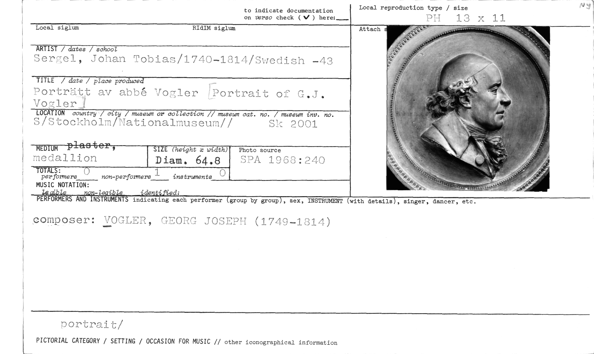 //// to indicate documentation //// on verso check (V ) here:_--- //// Local reproduction type / size //// PH 13 x 11 //// Local siglum RIdIM siglum //// ARTIST / dater / school //// Sergel, Johan Tobias/1740-1814/Swedish -43 //// TITLE / date / place produced //// Porträtt av abbe Vogler EPortrait of. G.J. //// Vogler 1 //// LOCATION country / city / museum or collection // museum cat. no. / museum inv. no. //// S/Stockholm/Nationalmuseum// Sk 2001 //// MEDIUM P1 //// medallion //// • 0 //// per formers non-p er f °m 1 instruments //// nstruments //// MUSIC NOTATION: //// le 40/e non-leaible identified: //// PERFORMERS AND INSTRUMENTS indicating each performer (group by group), aex, INSTRUMENT //// composer: VOGLER, GEORG JOSEPH (1749-1814) //// nortrait/ //// Attach //// SIZE (height x width) //// Diam. 64.8 //// Photo source //// SPA 1968:240 //// (with details), singer, dancer, etc. //// PICTORIAL CATEGORY / SETTING / OCCASION FOR MUSIC // other iconographical information ////