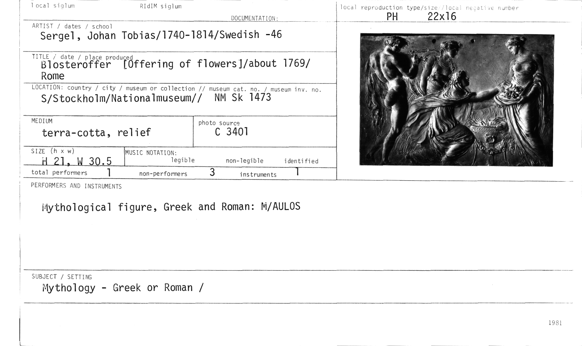//// 1 ocal siglum //// RIdIM siglum //// DOCUMENTATION: //// lotal reproduction type/size /lotal negative number //// PH 22x16 //// ARTIST / dates / school //// Sergel, Johan Tobias/1740-1814/Swedish -46 //// TITLE / date / place produced //// Blosteroffer [Offering of flowersi/about 1769/ Rome //// photo source //// C 3401 //// SIZE (h x w) //// H 21, W 30.5 //// total performers 1 //// MEDIUM //// terra-cotta, r elief //// MUSIC NOTATION: //// legible non-legible identified //// non-performers 3 instruments 1 //// LOCATION: country / city / museum or collection // museum cat. no. / museum inv. no. //// S/Stockholm/Na tionalmuseum// NM Sk 1473 //// PERFORMERS AND INSTRUMENTS //// Mythological figure, Greek and Roman: M/AULOS //// SUBJECT / SETTING //// Mythology - Greek or Roman / //// 1981 ////