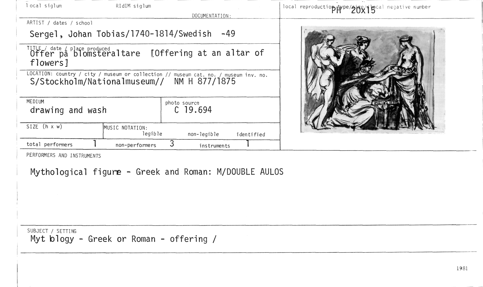 //// I ocal siglum RIdIM siglum //// local reproductiorlype/Ms•Oscal negative number //// DOCUMENTATION: //// ARTIST / dates / school //// Sergel, Johan Tobias/1740-1814/Swedish -49 //// TITLE / date 4 place produced //// Offer pa biomsteraltare [Offering at an altar of flowers] //// LOCATION: country / city / museum or collection // museum cat. no. / museum inv. no. //// S/Stockholm/Nationalmuseum// NM H 877/1875 //// photo source //// C 19.694 //// SIZE (h x w //// total performers 1 non-performers instruments 1 //// MEDIUM //// drawing and wash //// MUSIC NOTATION: //// legible non-legible identified //// PERFORMERS AND INSTRUMENTS //// Mythological figure - Greek and Roman: M/DOUBLE AULOS //// SUBJECT / SETTING //// Myt blogy - Greek or Roman - offering / ////