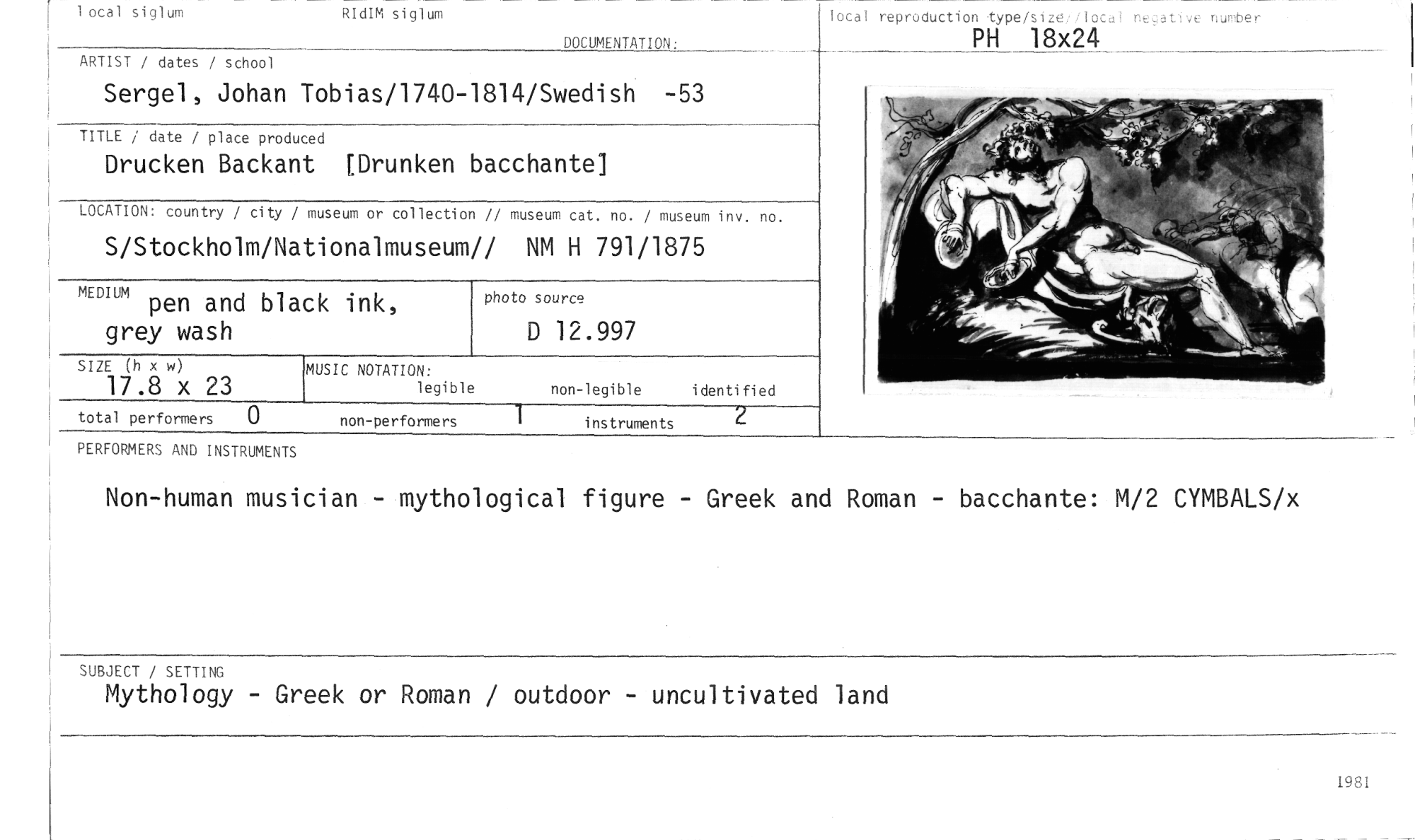 //// 1 ocal siglum RIdIM siglum //// DOCUMENTATION: //// ARTIST / dates / school //// Sergel, Johan Tobias/1740-1814/Swedish -53 //// TITLE / date / place produced //// Drucken Backant (Drunken bacchante] //// LOCATION: country / city / museum or collection // museum cat. no. / museum inv. no. //// S/Stockholm/Nationalmuseum// NM H 791/1875 //// MEDIUM pen and bla ck ink, grey wash //// SIZE (h x w) //// 17.8 x 23 //// lotal reproduction type/sizi/local negative number //// PH 18x24 //// photo source //// D 12.997 //// MUSIC NOTATION: //// legible //// non-legible identified //// total performers 0 non-performers 1 instruments //// PERFORMERS AND INSTRUMENTS //// Non-human musician - mythological figure - Greek and Roman - bacchante: M/2 CYMBALS/x //// SUBJECT / SETTING //// Mythology - Greek or Roman / outdoor - uncultivated land //// 1981 ////