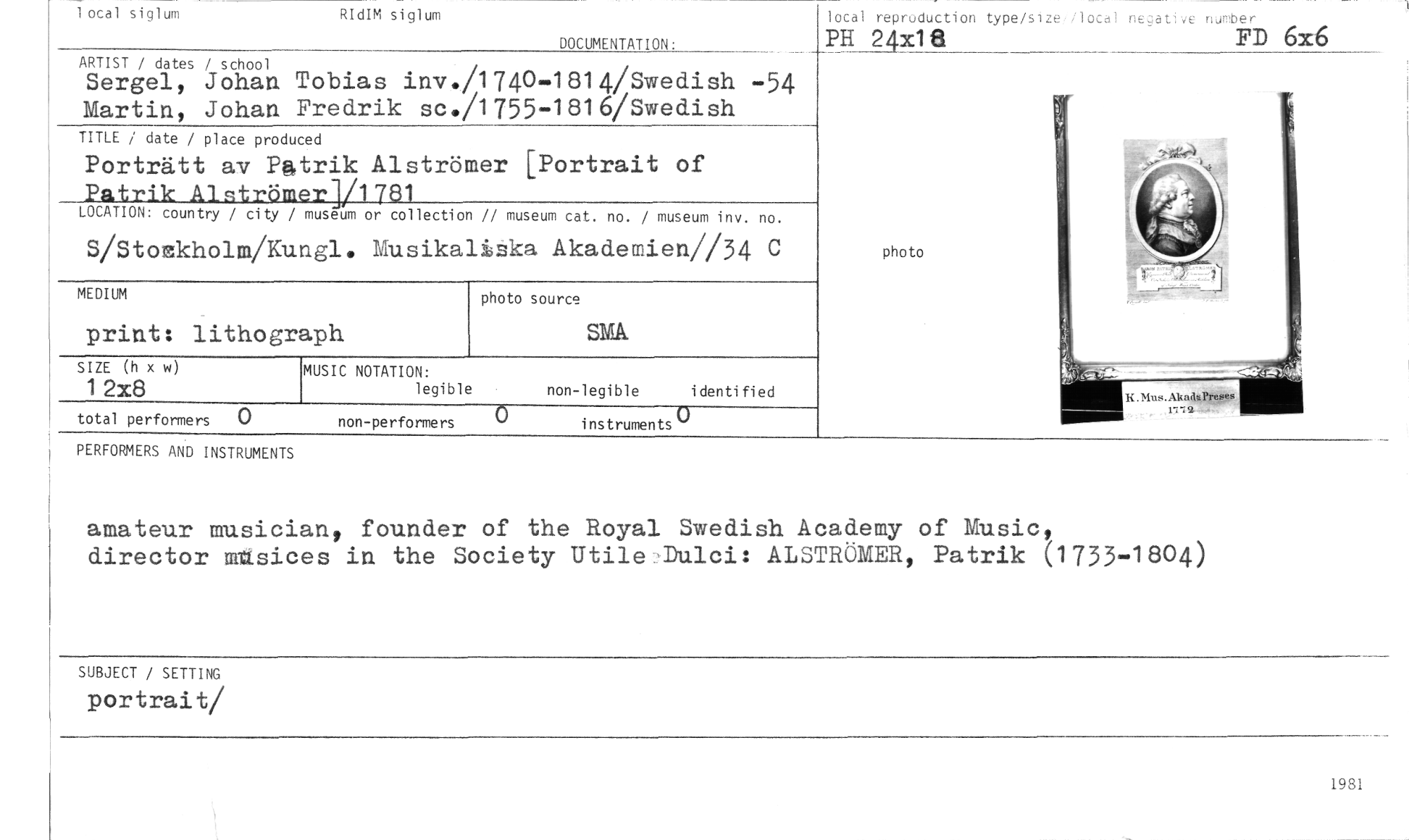 //// 1 ocal siglum RIdIM siglum //// MCUMEMNON: //// ARTIST / dates / school //// Sergel, Johan Tobias inv./1740-1814/Swedish -54 Martin, Johan Fredrik sc./1755-1816/Swedish //// TITLE / date / place produced //// Porträtt av Patrik Alströmer [Portrait of Patrik Aistrbmer]/1781 //// LOCATION, country / city / museum or collection // museum cat. no. / museum inv. no. //// S/Stozkholm/Kungl. Musikaliåka Akademien//34 C //// photo source //// print: lithogr aph //// SIZE (h x w) //// 1 2x8 //// total performers 0 non-performers 0 instruments° //// MEDIUM //// MUSIC NOTATION: //// legible non-legible i denti fi ed //// SISA //// I oca 1 repr,duction type/sIze ,ber //// PH 24x18 FD 6x6 //// //// photo //// x. Mus. AkaaK //// 1.1;a //// PERFORMERS AND INSTRUMENTS //// amateur uusiciant founder of the Royal Swedish Academy of Music, //// director uasices in the Society Utile Dulci: ALSTRAIER, Patrik (1733-1804) //// SUBJECT / SETTING //// portrait/ //// 1981 ////