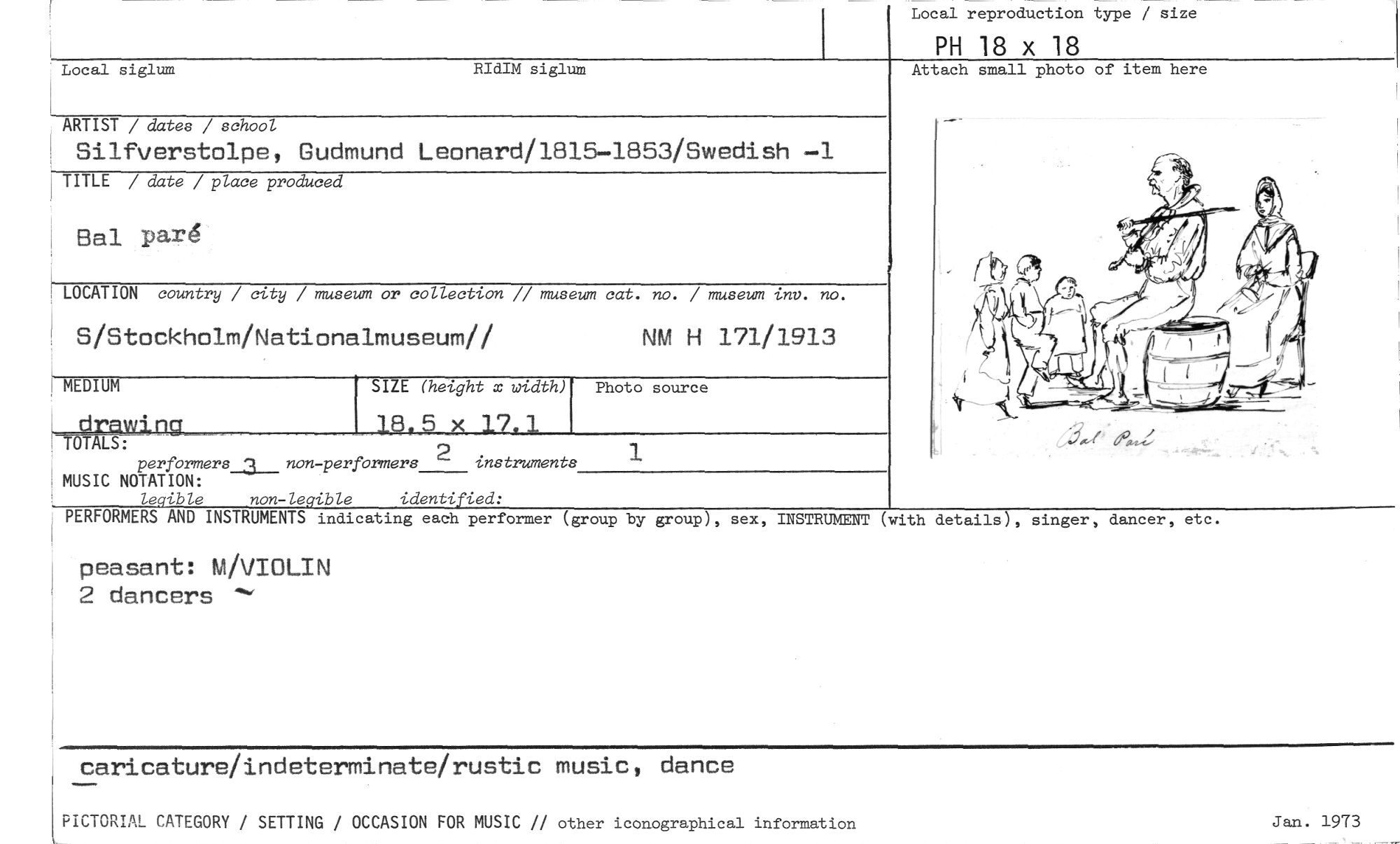 //// Local reproduction type / size //// PH 18 x 18 //// Local siglum RIdIM siglum //// ARTIST / dates / school //// Silfverstolpe, Gudmund Leonard/1815-1853/Swedish -1 //// TITLE / date / place produced //// Bal parti //// LOCATION country / city / museum or collection // museum cat. no. / museum inv. no. //// S/Stockholm/Nationalmuseum// NM H 171/1913 //// MEDIUM SIZE (height x width) Photo source //// _ovisa B3,5 x 17.1 //// TOTALS: //// performers 3 non-performers instruments //// MUSIC NOTATION: //// legible non-leoible identified: //// Attach small photo of item here //// PERFORMERS AND INSTRUMENTS indicating each performer (group by group), sex, INSTRUMENT (with details), singer, dancer, etc. //// peasant: M/VIOLIN 2 dancers " //// caricature/indeterminate/rustic music, dance //// PICTORIAL CATEGORY / SETTING / OCCASION FOR MUSIC // other iconographical information Jan. 1973 ////