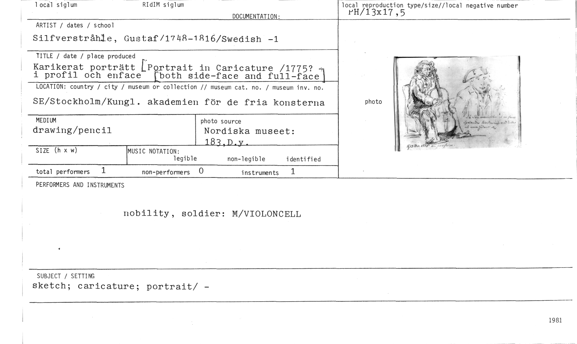 //// local siglum RIdIM siglum //// DOCUMENTATION: //// local reproduction type/size//local negative number //// VH/13X17,5 //// ARTIST / dates / school //// Silfyerstråhle, Gustaf/1748-1816/Swedish -1 //// TITLE / date / place produced //// Karikerat porträtt EPrtrait in Caricature /1775? 1 //// i profil och enface [both side-face and full-face //// LOCATION: country / city / museum or collection // museum cat. no. / museum inv. no. //// SE/Stockholm/Kungl. akademien för de fria konsterna //// //// MEDIUM photo source //// drawing/pencil Nordiska museet: //// 183,D.y. //// //// //// //// //// photo //// //// SIZE (h x w) //// MUSIC NOTATION: //// legible non-legible identified //// total performers 1 non-performers 0 instruments 1 //// PERFORMERS AND INSTRUMENTS //// nobility, soldier: M/VIOLONCELL //// SUBJECT / SETTING //// sketch; caricature; portrait/ //// 1981 ////