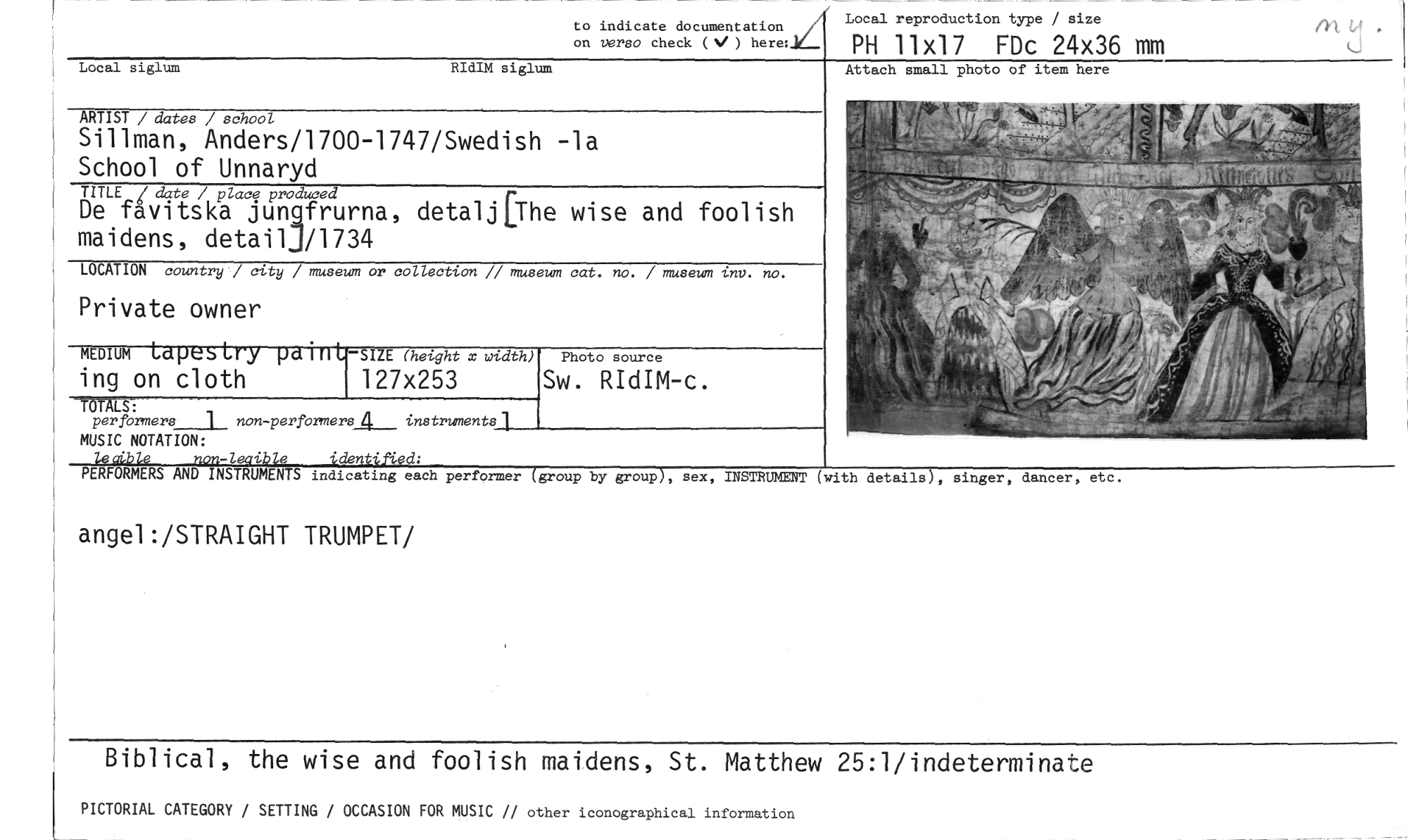 //// to indicate documentation on verso check (V ) here: //// Local reproduction type / size //// PH 11x17 FDc 24x36 mm //// Attach small photo of item here //// Local siglum RIdIM siglum //// TITLE ‘ekte/placepn2duced //// De favitska jungrurna, detalj[The wise and foolish maidens, detail]/1734 //// LOCATION country / city / museum or collection // museum cat. no. / museum inv. no. //// Private owner //// —SIZE (height x width) //// 127x253 //// angel:/STRAIGHT TRUMPET/ //// Biblical, the wise and foolish maidens, St. Matthew 25:1/indeterminate //// PICTORIAL CATEGORY / SETTING / OCCASION FOR MUSIC // other iconographical information //// MEDIUM LdpesLry pcuint //// ing on cloth //// TOTALS: //// performere___1_ non-performersA,__ instruments //// MUSIC NOTATION: //// lecible non-leaible identified: //// PERFORMERS AND INSTRUMENTS indicating each performer (group by group), sex, INSTRUMENT (with details), singer, dancer, etc. //// ›If //// -4, - - //// Photo source //// Sw. RIdIM-c. //// ARTIST / dates / school //// Sillman, Anders/1700-1747/Swedish -la School of Unnaryd ////