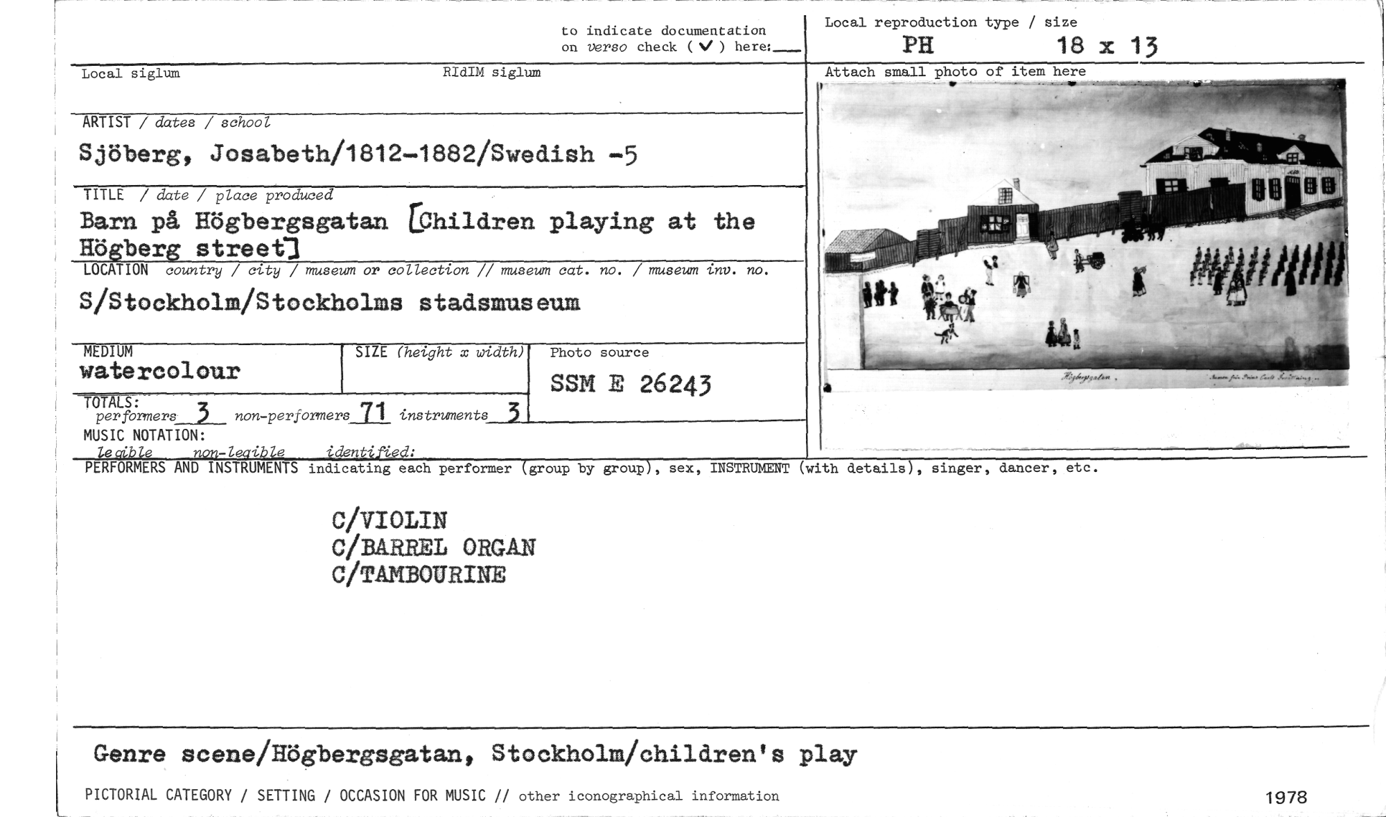 //// to indicate documentation //// on versa check ( NI ) here:_ //// PH 18 x 13 //// Local reproduction type / size //// Attach small photo 0 //// item here //// Local siglum RIdIM siglum //// ARTIST / dates / school //// Sjöberg, Josabeth/1812-1882/Swedish -5 //// TITLE / date / place produced //// Barn på Högbergsgatan [Children playing at the Högberg street.] //// LOCATION country / city / museum or collection // museum cat. no. / museum inv. no. //// S/Stockholm/Stockholms stadsmuseum //// SIZE (hetght x width) //// TbTALS: //// perfbrmers 3 non-performers 71 instruments 3 //// MUSIC NOTATION: //// le ib le non-leaible identified: //// PERFORMERS AND INSTRUMENTS indicating each performer group by grouPI, sex, INSTRUMENT (with details), singer, dancer, etc. //// C/VIOLIN //// C/BARREL ORGAN C/TAMBOURINE //// Genre scene/Högbergsgatan, Stockholm/children's play //// PICTORIAL CATEGORY / SETTING / OCCASION FOR MUSIC // other iconographical information 1978 //// MEDIUM //// watercolour //// Photo source //// SSM E 26243 ////
