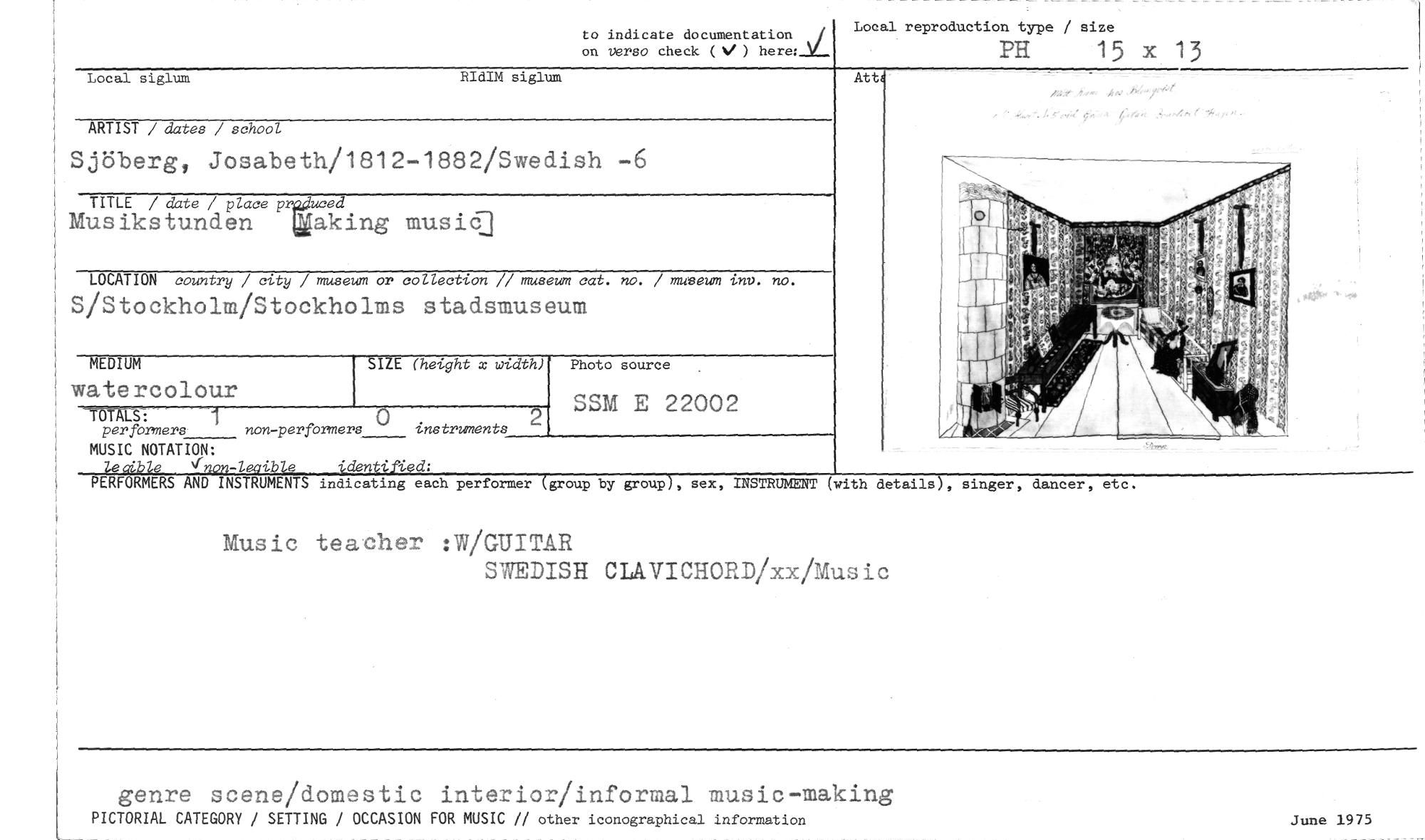 //// to indicate documentation //// on verso check (V ) here:-Y-- //// Local reproduction type / size //// PH 15 //// 13 //// Att //// ARTIST / dates / school 1812-1882/Swedish -6 //// Sjöberg, Josabeth/ //// TITLE / date / place p uced //// Musikstunden aking music] //// LOCATION country / city / ~mon or collection // museum cat. no. / museto; in». no. //// S/Stockholm/Stockh lms stadsmuseum //// M //// per formers non-perfbrmers () instruments //// TÖTALS: 1 //// MUSIC NOTATION: //// Local siglum RIdIM siglum //// I //// watercolour //// EDIUM //// SIZE (height x width) //// 2 //// Photo source //// SSM E 22002 //// PERFORMERS AND INSTRUMENT //// indicating each //// performer //// group by group //// , sex, INSTRUMENT (with details //// , singer, dancer, etc. //// Music teacher :W/GUITAR //// SWEDISH CIAVICHORD/xx/Music //// genre scene/domestic interior/informal music-making //// PICTORIAL CATEGORY / SETTING / OCCASION FOR MUSIC // other iconographical information June 1975 ////