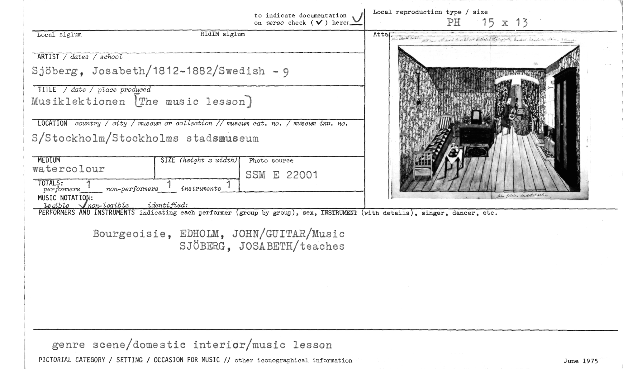 //// to indicate documentation //// on verso check (V ) here: ‘j //// Local reproduction type / size //// PH 15 x 13 //// Local siglum RIdIM siglum //// SIZE (height x width) //// MUSIC NOTATIOp: //// leaibleNinon-leaible -&entified: //// PERFORMERS AND INSTRUMENTS iodicating each performer (group by group), sex, INSTRUMENT //// Bourgeoisie, EDHOLM, JOHN/GUITAR/Music SJÖBERG, JOSABETH/teaches //// ARTIST / dates / school //// Sjöberg, Josabeth/1812-1882/Swedish -9 //// Musiklektionen rThe music lesson') //// TITLE / date / place produced //// LOCATION country / city / museum or collection // museum eat. no. / museum tnv. no. //// S/Stockholm/Stockholms stadsmuseum //// MEDIUM //// watercoIour //// -TUnrg: i //// per formers non-per formers 1 instruments //// Photo source //// SSM E 22001 //// etc. //// dancer, //// (with details), singer, //// genre scene/domestic interior/music lesson //// PICTORIAL CATEGORY / SETTING / OCCASION FOR MUSIC // other iconographical information //// June 1975 ////