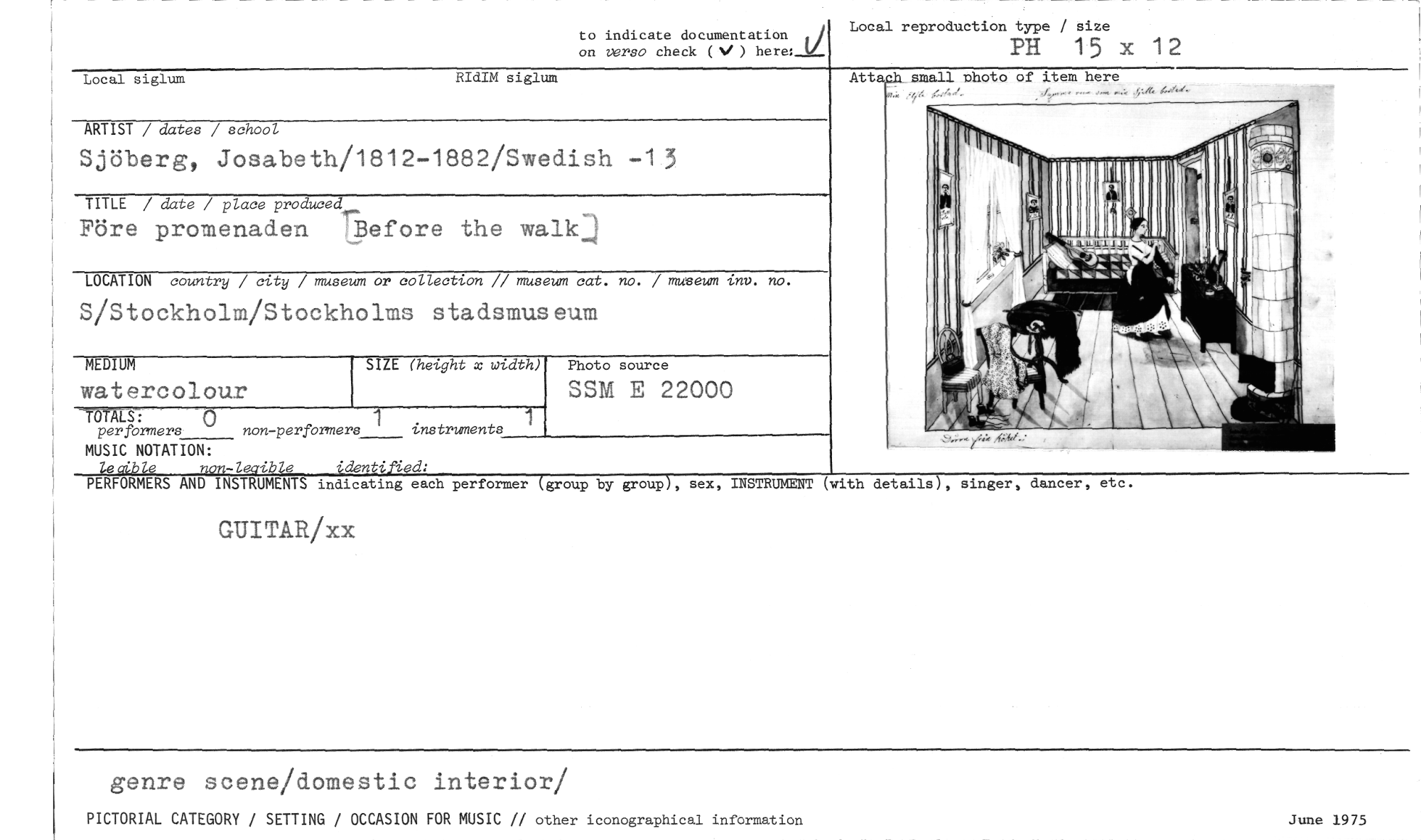 //// to indicate documentation on versa check (V) here: //// Local reproduction type / size //// PH 15 x 12 //// Atta small nhoto of item here //// Local siglum RIdIM siglum //// TITLE / date / pZace produced //// Före promenaden tBefore the walkj //// S/Stockholm/Stockholms stadsmuseum //// SIZE (height x width) //// TOTÅLS: 0 1 //// per formers non-per formers instruments //// MUSIC NOTATION: //// leaible non-lecible identified: //// PERFORMERS AND INSTRUMENTS indicating each //// GUITAR/xx //// MEDIUM //// wateroolour //// 1 //// ARTIST / dates / school //// Sjöberg, Josabeth/1812-1882/Swedish -13 //// LOCATION country / city / museum or collection // museum cat. no. / museum inv. no. //// Photo source //// SSM E 22000 //// performer (group by group), sex, INSTRUMENT (with details), ringer, dancer, etc. //// genre scene/domestic interior/ //// PICTORIAL CATEGORY / SETTING / OCCASION FOR MUSIC // other iconographical information //// June 1975 ////