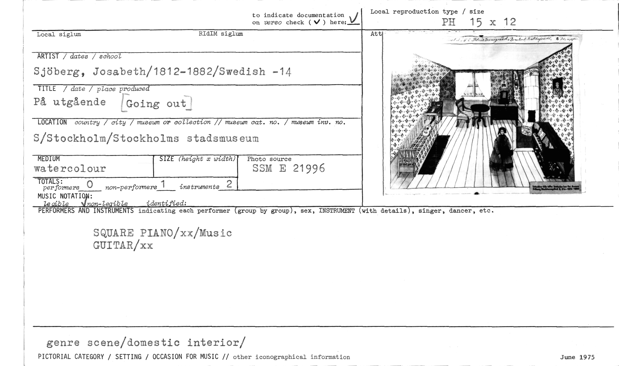 //// to indicate documentation //// on verso check (V) here:__ //// Local reproduction type / size //// PH 15 x 12 //// Local siglum RIdIM siglum //// ARTIST / dates / school //// TITLE / date / place produced //// På utgående Going out, //// S/Stockholm/Stockholms stadsmuseum //// SIZE (height x width) //// per formers () non-performers 1 instruments //// MUSIC NOTATION: //// leuibie Ninon-leaible identified: //// PERFORMERS AND INSTRUMENTS indicating each performer (group by //// SQUARE PIANO/xx/Music GUITAR/xx //// Att //// group), sex, INSTRUMENT (with details), singer, dancer, etc. //// MEDIUM //// watercolour //// Sjöberg, Josabeth/1812-1882/Swedish -14 //// LOCATION country / city / museum or collection // museum cat. no. / museum inv. no. //// Photo source //// SSM E 21996 //// genre scene/domestic interior/ //// PICTORIAL CATEGORY / SETTING / OCCASION FOR MUSIC // other iconographical information June 1975 ////