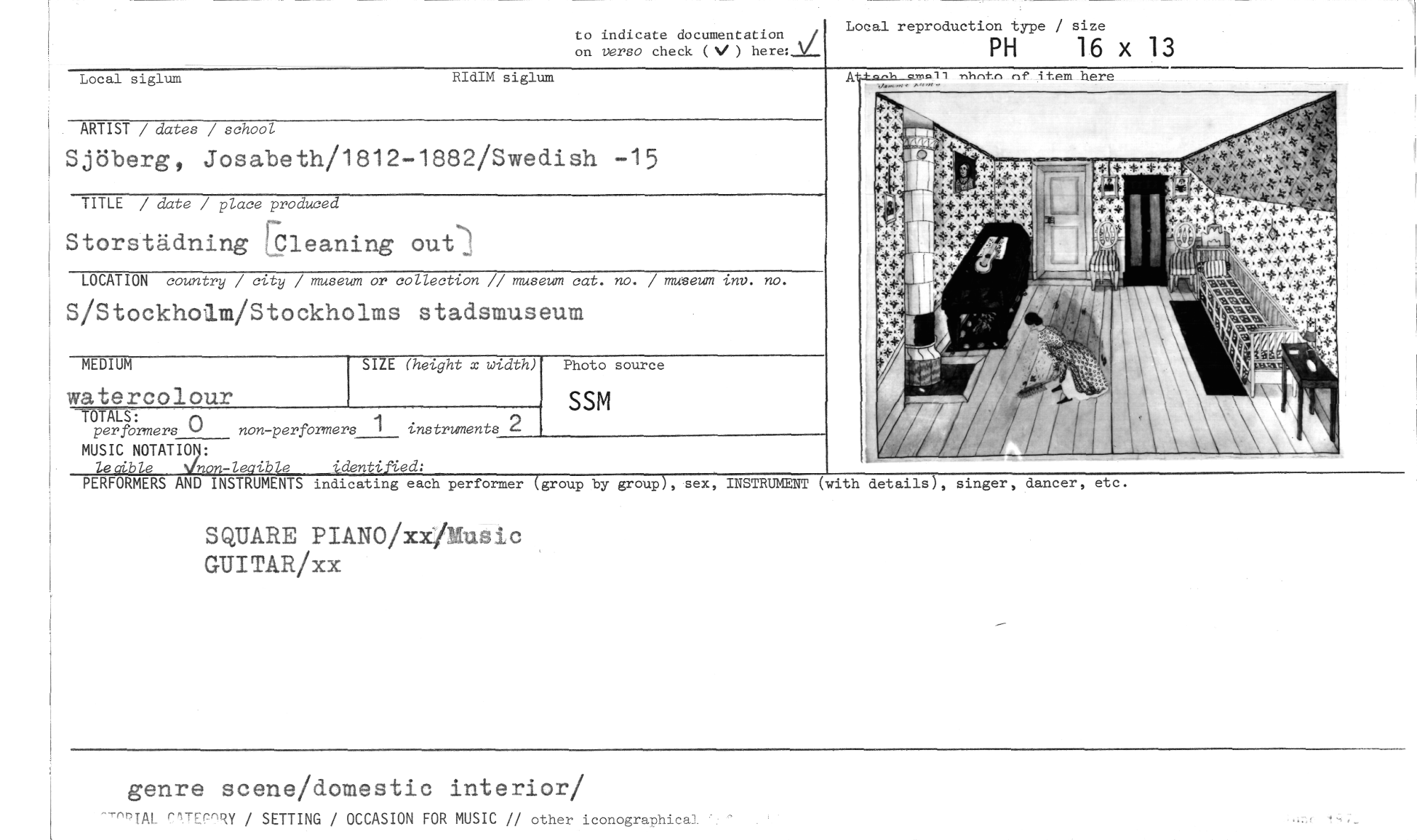 //// to indicate documentation //// on verso check (V ) hereLY__ //// Local reproduction type / size //// PH 16 x 13 //// nal] nhntn nf item here //// Local siglum RIdIM siglum //// ARTIST / dates / school //// Sjöberg, Josabeth/1812-1882/Swedish -15 //// TITLE / date / place produced //// r- //// Storstädning egleaning out-j //// LOCATION country / city / museum or collection // museum cat. no. / museum inv. no. //// S/Stockholm/Stockholms stadsmuseum //// MEDIUM //// watercolour //// Photo source //// SIZE (height x width) //// -TOIALS: //// per formers C) non-performers 1 //// SSM //// instruments //// MUSIC NOTATION: //// hinon-leaible eden ified: //// PERFORMERS AND INSTRUMENTS indicating each performer //// dancer, etc. //// INSTRUMENT (with details), singer //// group), sex, //// (group by //// S QUARE PIANO/xx/Music GUITAR/xx //// genre seene/domestie interior/ //// "TAL (77EC-^2Y / SETTING / OCCASION FOR MUSIC // other iconographical ////