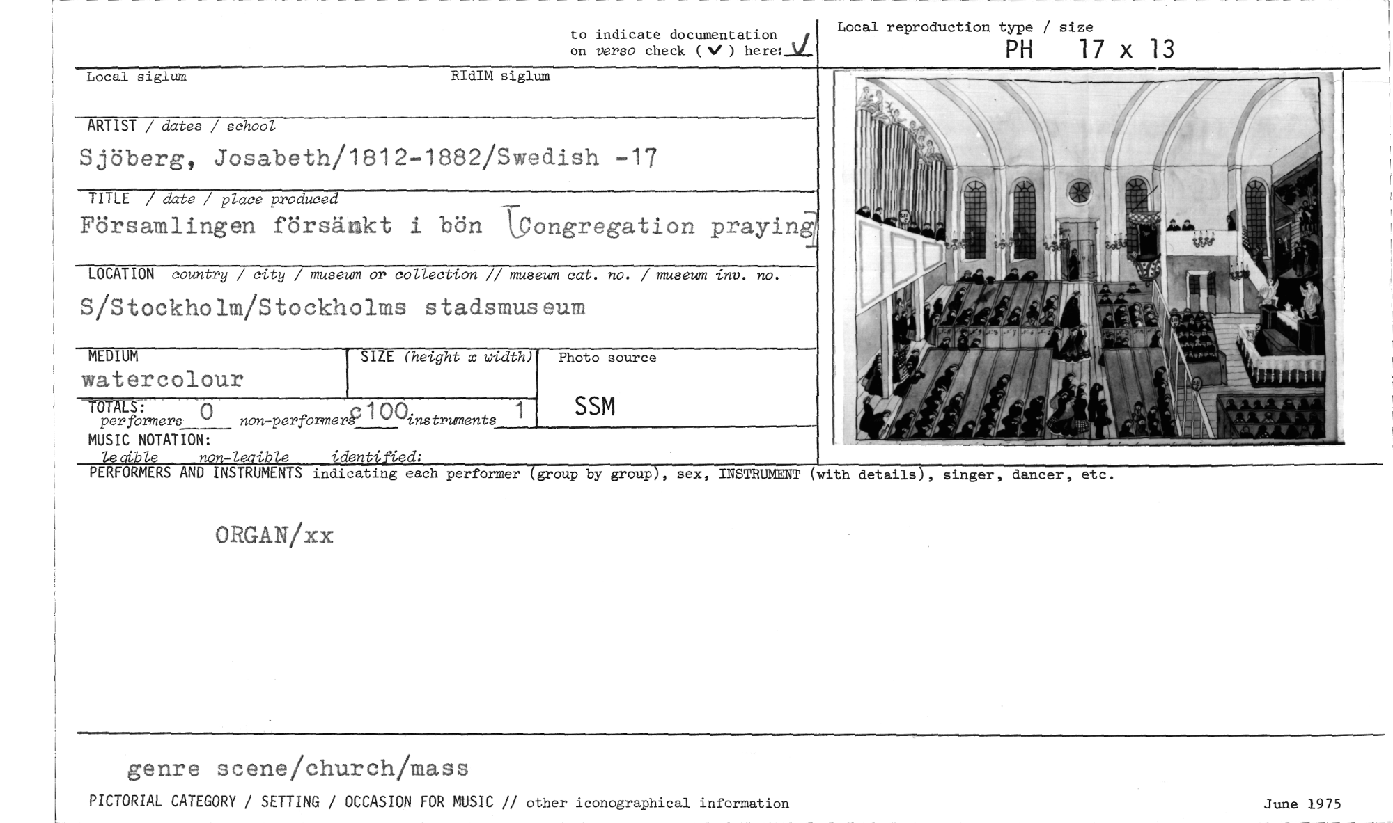 //// to indicate documentation //// Local reproduction type / size //// . / //// on versa check (w') hereLM_ PH 17 x 13 //// Local siglum RIdIM siglum //// ARTIST / dates / school //// Sjöberg, Josabeth/1812-1882/Swedish -17 //// TITLE / date / place produced //// Församlingen försänkt i bön l.ongregation prayin //// LOCATION country / city / museum or collection // museum cat. no. / museum tnv. no. //// S/Stockholm/Stockholms stadsmuseum //// SIZE (height x width) //// -ron: //// perforners 0 non- perfOrmer91 CAnstruments //// MUSIC NOTATION: //// Zecribie non-lecible identiffed: //// PERFORMERS AND INSTRUMENTS indicating each performer (group by group), sex, INSTRUMENT (with details5, singer, dancer, etc. //// ORGAN/xx //// MEDIUM //// watercolour //// Photo source //// SSM //// genre scene/church/mass //// PICTORIAL CATEGORY / SETTING / OCCASION FOR MUSIC // other iconographical information //// June 1975 ////