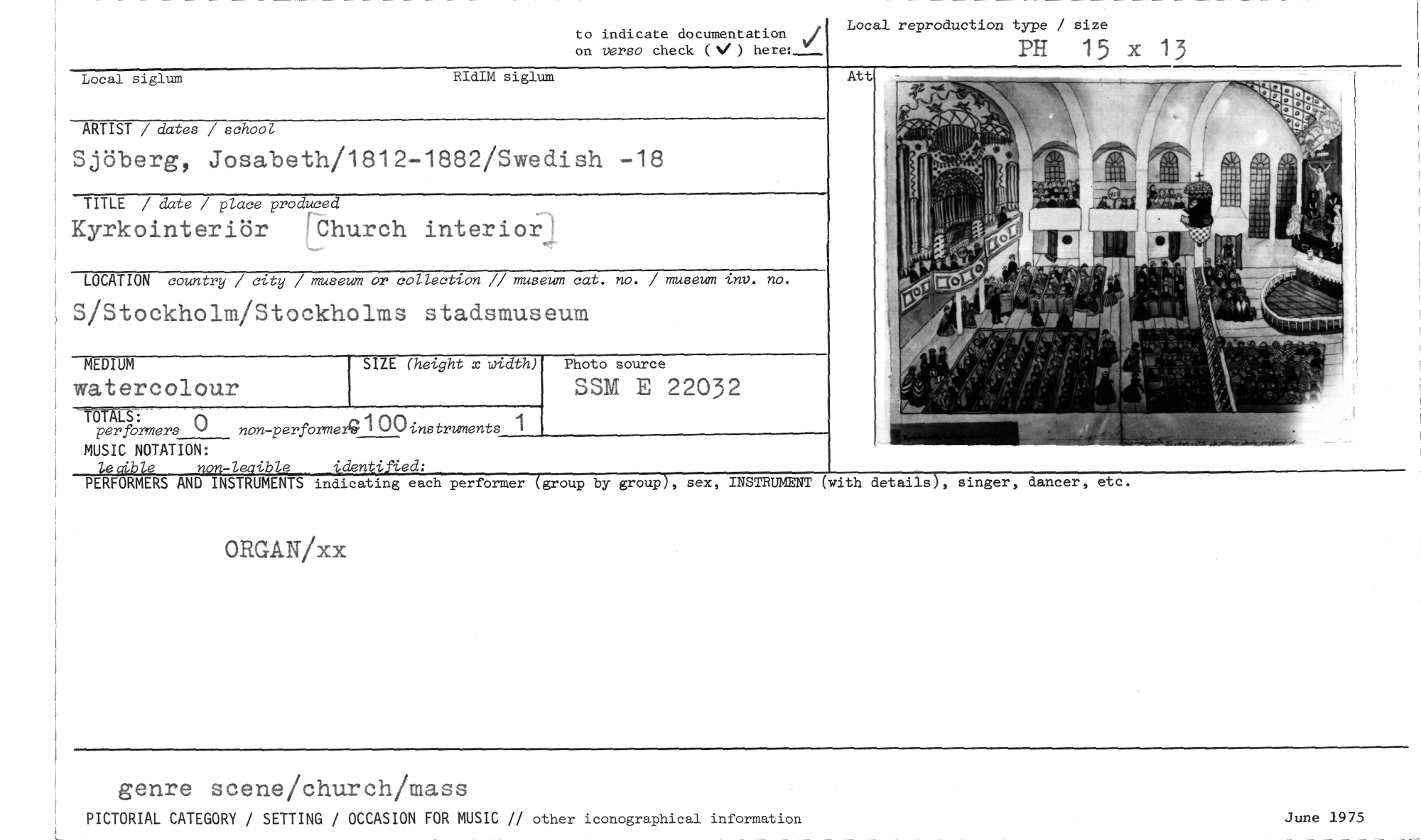 //// to indicate documentation / //// on verso check (d) here:_—. //// Local reproduction type / size //// PH 15 x 13 //// Local siglum RIdIM siglum //// ARTIST / dates / school //// Sjöberg, Josabeth/1812-1882/Swedish -18 //// TITLE / date / place produced //// Kyrkointeriör Church interiorj //// LOCATION country / city / museum or collection // museum cat. no. / museum inv. no. //// S/Stockholm/Stockholms stadsmuseum //// Att //// MEDIUM //// watercolour //// SIZE (height x width) //// Photo source //// SSM E 22032 //// performers 0 non-performerg 1 00instrunents 1 //// MUSIC NOTATION: //// non-lecible identified: //// PERFORMERS AND INSTRUMENTS indicating each performer (group by group), sex, INSTRUMENT (with details), singer, dancer, etc. //// ORGAN/xx //// genre scene/church/mass //// PICTORIAL CATEGORY / SETTING / OCCASION FOR MUSIC // other iconographical information June 1975 ////