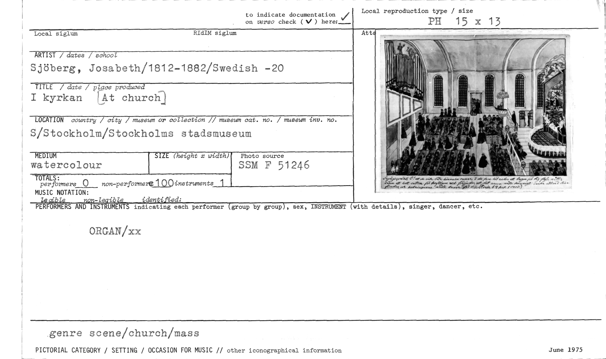 //// June 1975 //// genre scene/church/mass //// PICTORIAL CATEGORY / SETTING / OCCASION FOR MUSIC // other iconographical information //// to indicate documentation //// Local reproduction type / size //// ve //// on versa check (V) //// PH 15 x 13 //// Local siglum R dIM siglum //// ARTIST / dates / school //// Sjöberg, Josabeth/1812-1882/Swedish -20 //// TITLE / date / p>ce produced //// I kyrkan lAt churc] //// LOCATION country / city / museum or collection // museum est. no. / museum inv. no. //// S/Stockholm/Stockholms stadsmuseum //// SIZE (height x width) //// SSM F 51246 //// Photo source //// Att //// MEDIUM //// watercolour //// per formers 0 non-performeot1410instrimentsj //// MUSIC NOTATION: //// lesible non-legible identified: //// PERFORMERS AND INSTRUMENTS indicating each performer (group by group), sex, INSTRUMENT (with details), singer, dancer, etc. //// r4a sfryt.A... ar, //// ORGAN/xx ////