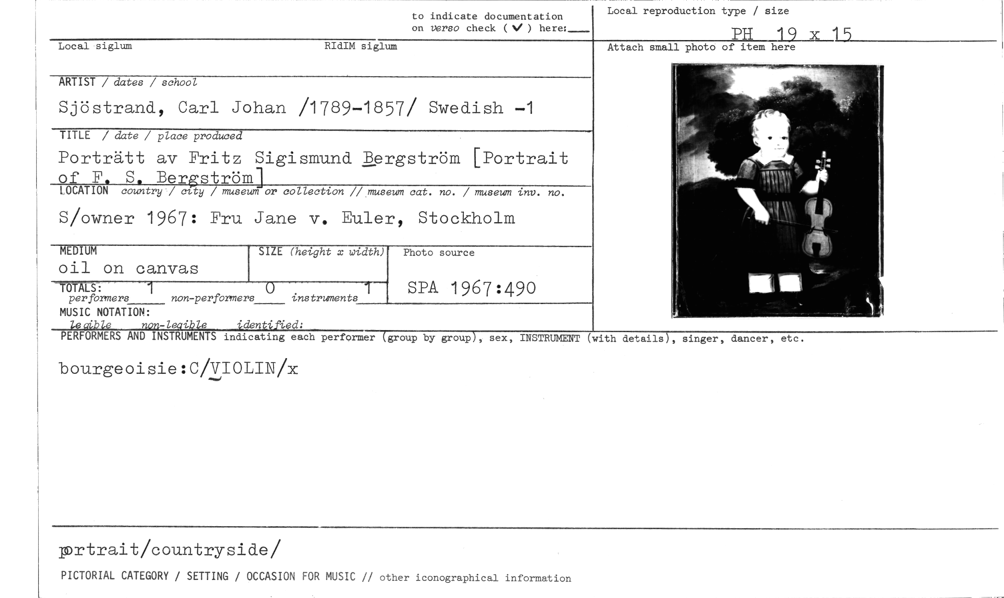 //// to indicate documentation //// on verso check (V ) here: //// Local reproduction type / size //// PH 19 3C 15 //// Attach small photo of item here //// Local siglum RIdIM siglum //// (with details), singer, dancer, etc. //// ARTIST / dates / school //// Sjöstrand, Carl Johan /1789-1857/ Swedish —1 //// TITLE / date / place produced //// Porträtt av Fritz Sigismund Bergström [Portrait //// of F. S. Bergström] //// LOCATION countrli] city / museum or collection //,museum cat. no. / museum inv. no. //// S/owner 1967: Fru Jane v. Euler, Stockholm //// SIZE (height x width) //// TÖMS: 1 //// per formers non-perfbrmers instruments //// MUSIC NOTATION: //// non-leaible identeUd; //// PERFORMERS AND INSTRUMENTS indicating each performer (group by group), sex, INSTRUMENT //// bourgeoisie:C/VIOLIN/x //// MEDIUM //// oil on canvas //// Photo source //// SPA 1967:490 //// prtredA/colurtryside/ //// PICTORIAL CATEGORY / SETTING / OCCASION FOR MUSIC // other iconographical information ////