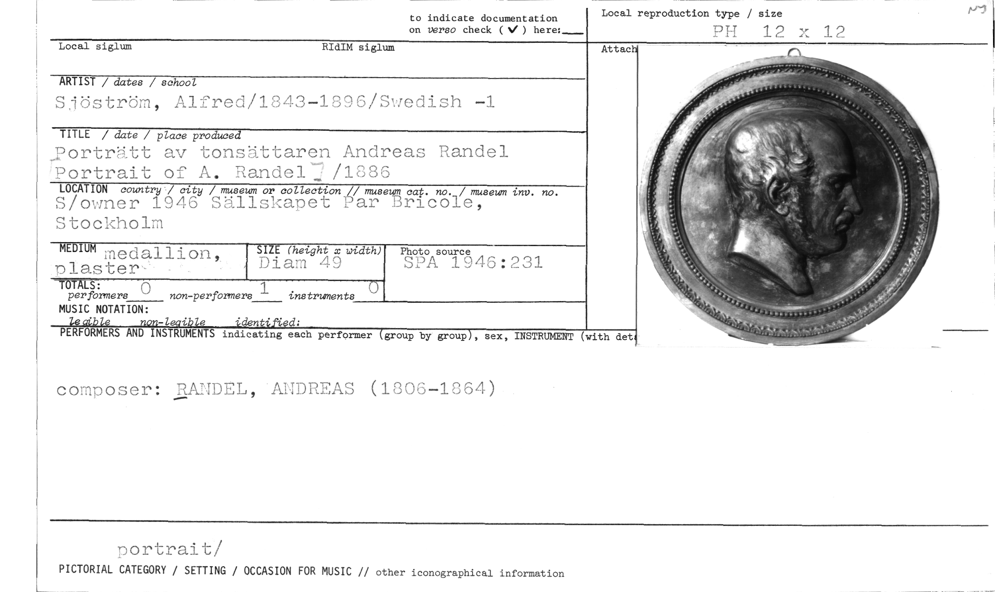 //// to indicate documentation //// on verso check (V ) here:___ //// Local reproduction type / size //// PH 12 x 12 //// Local siglum RIdIM siglum //// Attach //// ARTIST / dates / school //// Sjöström, Alfred/1843-1896/Swedish -1 //// TITLE / date / place produced //// orträtt av tonsättaren Andreas Randel 'Portrait of A. Randel -7/1886 //// LOCATION country7 city / museum or collection// museum cap. no. / museum inv. no. //// S/owner 1946 SällskapetPar Bricole, Stockholm //// MEDIUM medallion, //// piaster-- //// n"1346:231 //// SIZE (height x width) //// Diam 49 //// TOTALS: 0 //// per formers non-performers 1 instruments //// MUSIC NOTATION: //// le oible non-lecible identified: //// PERFORMERS AND INSTRUMENTS indicating each performer (group by group), sex, INSTRUMENT (with det //// composer: 12ANDEL, ANDREAS (1306-1864) //// nortrait/ //// PICTORIAL CATEGORY / SETTING / OCCASION FOR MUSIC // other iconographical information ////