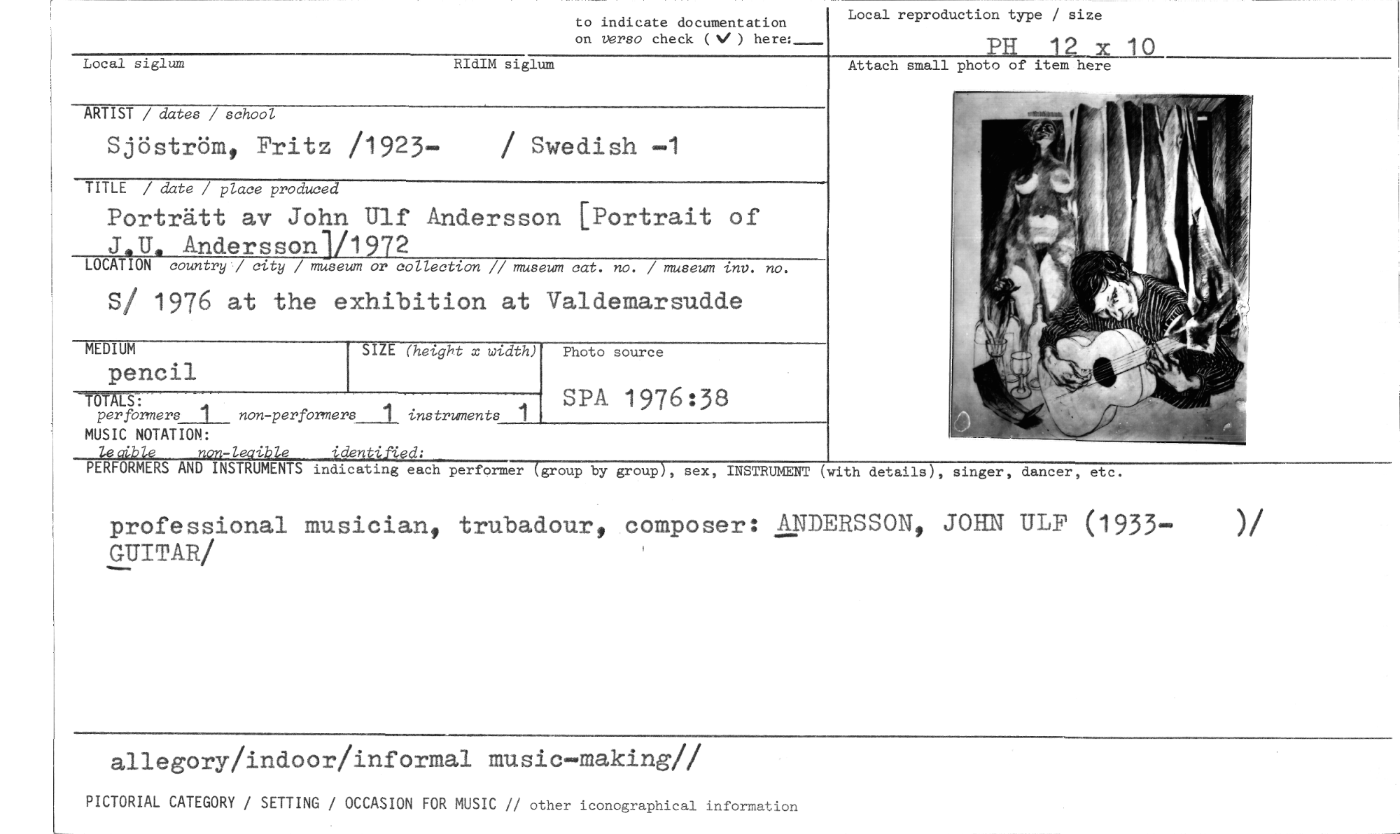 //// Local siglum RIdIM siglum //// to indicate documentation //// on verso check ( V ) here:_ //// Local reproduction type / size //// Attach small photo of item here //// PH 12 x 10 //// ARTIST / dates / school //// Sjöström, Fritz /1923— / Swedish —1 //// TITLE / date / place produced //// Porträtt av John Ulf Andersson [Portrait of J.U. Andersson]/1972 //// LOCATION country / city / museum or collection // museum cat. no. / museum inv. no. //// si 1976 at the exhibition at Valdemarsudde //// MEDIUM SIZE (height x width) //// pencil //// //// T T IS: //// per formers 1 non-performers___11_ instruments 1 //// //// MUSIC NOTATION: //// lecrible non-leaible identified: //// PERFORMERS AND INSTRUMENTS //// Photo source //// SPA 1976:38 //// indicating each performer (group by group), sex, INSTRUMENT (with details), singer, dancer, etc. //// professional musician, trubadour, composer: ANDERSSON, JOHN ULF (1933— GUITAR/ //// allegory/indoor/informal music—makingll //// PICTORIAL CATEGORY / SETTING / OCCASION FOR MUSIC // other concgraphical information ////