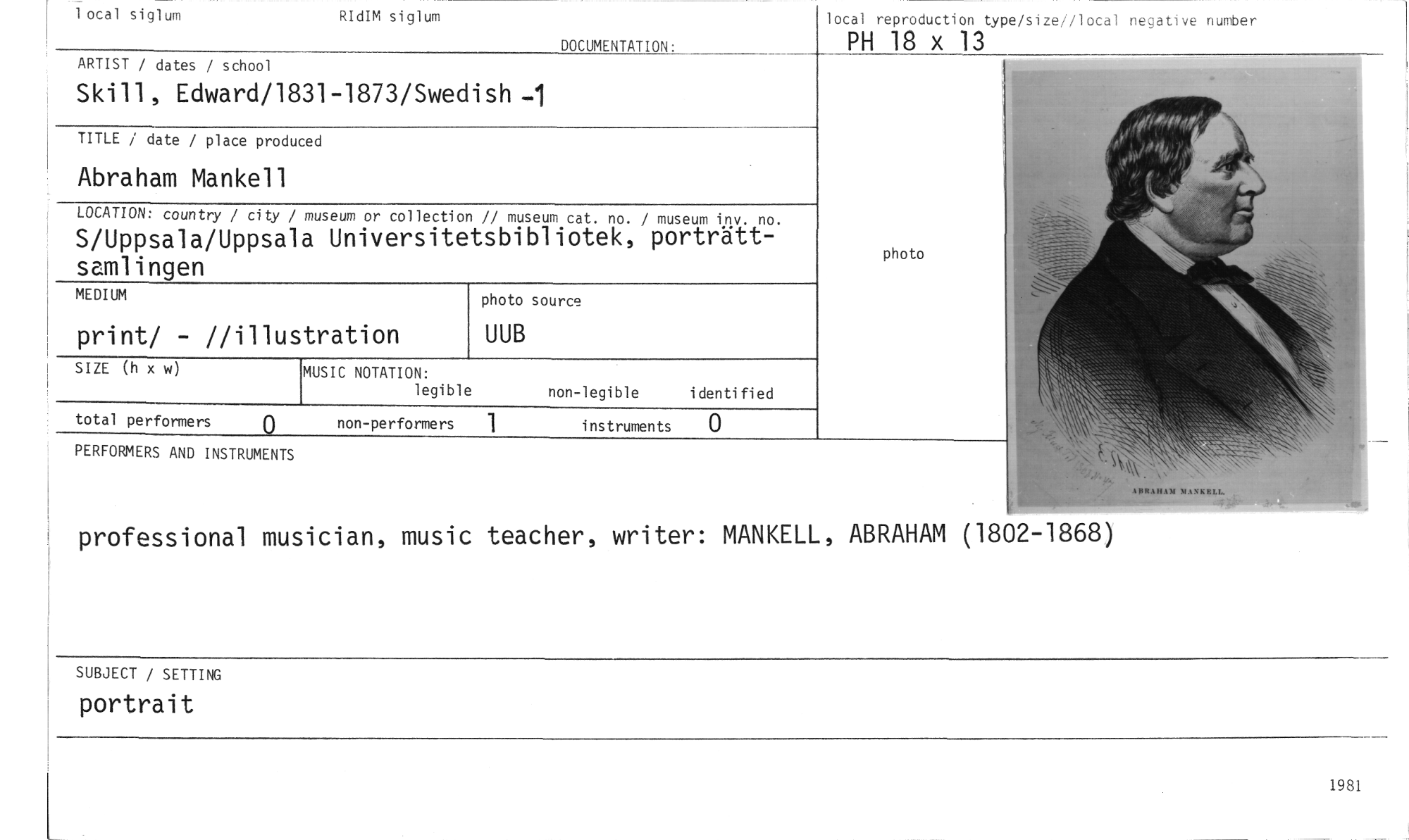 //// 1 ocal siglurn RIdIM siglum //// DOCUMENTATION: //// local reproduct on type/size//local negative nutuber //// PH 18 x 13 //// ARTIST / dates / school //// Skill, Edward/18 31-1873/Swedish -1 //// TITLE / date / place produ ed //// Abraham Mankell //// LOCATION: country / city / //// S/Uppsala/Uppsal samlingen //// MEDIUM //// print/ - //illus tration //// SIZE (h x w) //// total performers 0 //// PERFORI1ERS AND INSTRUMENTS //// photo //// photo source //// UUB //// museum or collection // museum cat. no. / museum inv. no. //// a Universitetsbibliotek, porträtt- //// non-performers 1 instruments 0 //// MUSIC NOTATION: //// legible non-legible identified //// professional musician, music teacher, writer: MANKELL, ABRAHAM (1802-1868) //// SUBJECT / SETTING //// portrait //// 1981 ////